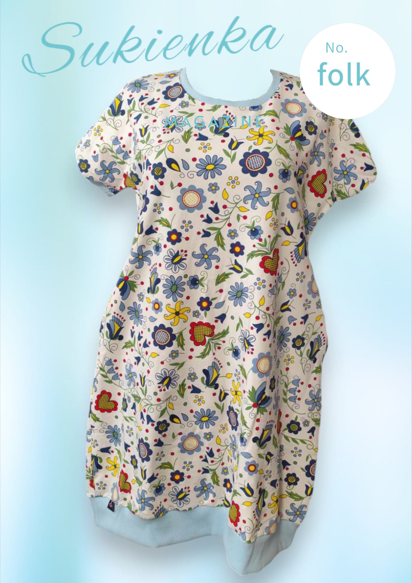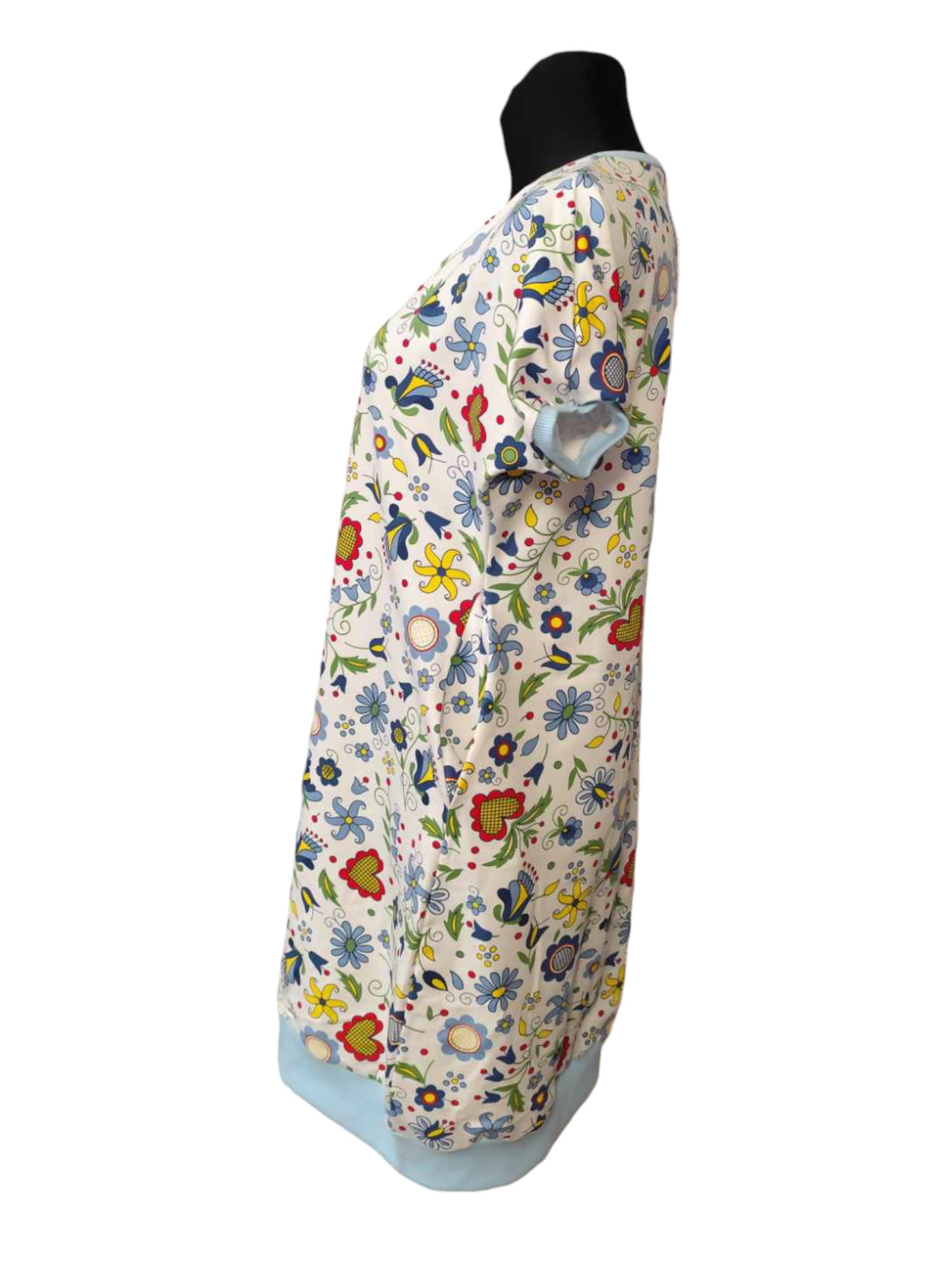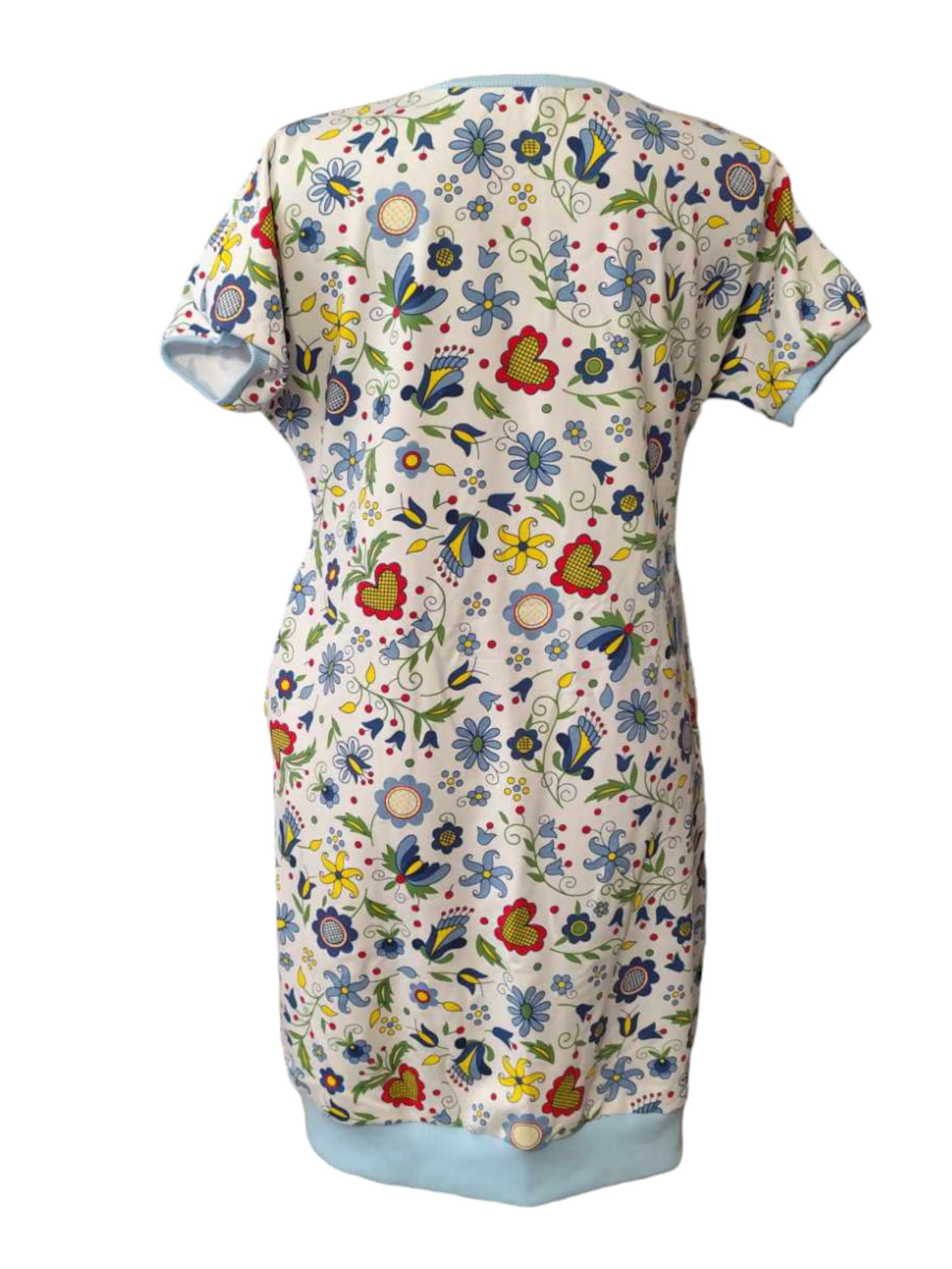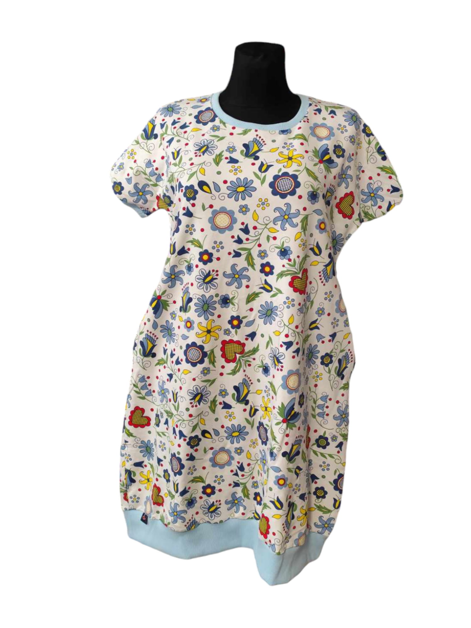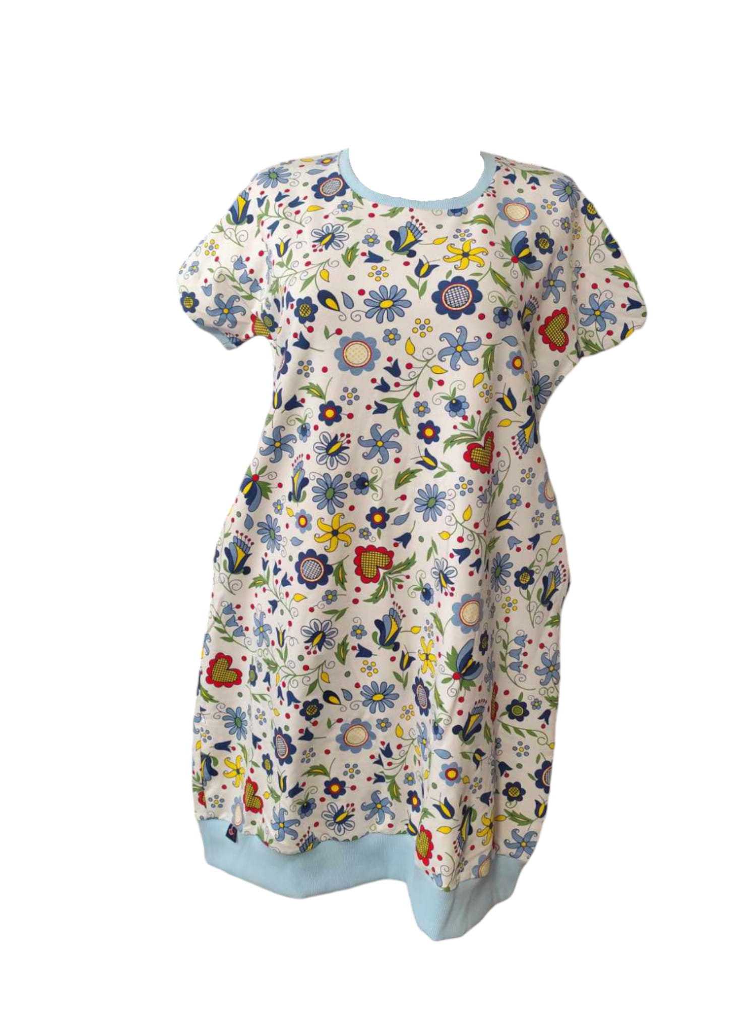 Biała sukienka z krótkim rękawem, wykonana z wysokiej jakości bawełny ozdobionej tradycyjnymi, ludowymi wzorami kaszubskimi, to połączenie komfortu z wyjątkowym, folkowym stylem. Luźny krój sukienki gwarantuje swobodę ruchów, co sprawia, że jest idealna na co dzień. Sukienka posiada praktyczne kieszenie, a rękawy i dół wykończone są jasnoniebieskim ściągaczem, który nadaje jej lekko sportowy, a zarazem elegancki wygląd. Fason w kształcie delikatnej "bombki" subtelnie podkreśla sylwetkę, dodając całości lekkości i kobiecości.