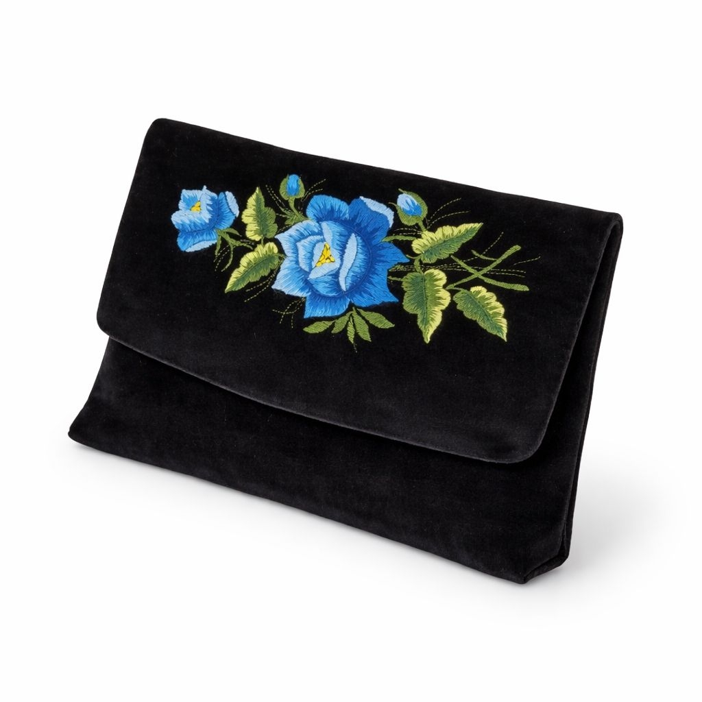 Elegancka torebka kopertowa wykonana z głębokiego, czarnego aksamitu, ozdobiona ręcznie wykonanym haftem inspirowanym tradycyjnym wzornictwem łowickim. Centralnym elementem kompozycji jest wyrazista, niebieska róża z delikatnymi zielonymi liśćmi, która pięknie kontrastuje z ciemnym tłem, nadając całości wyjątkowej głębi i szlachetnego charakteru.