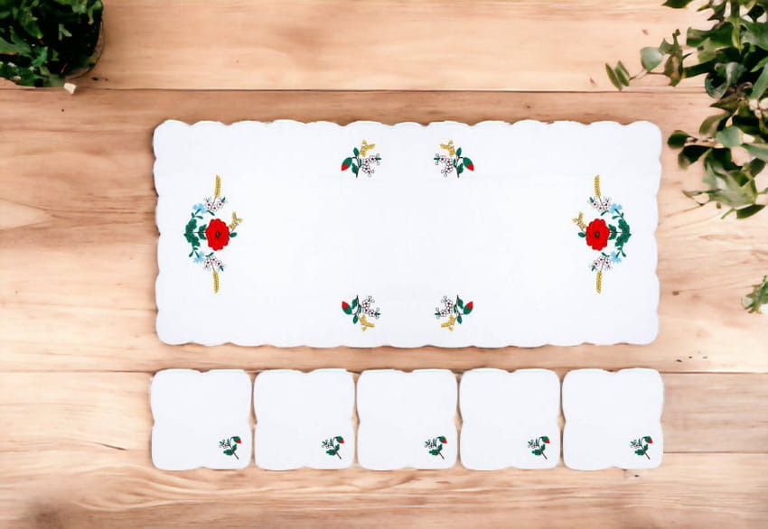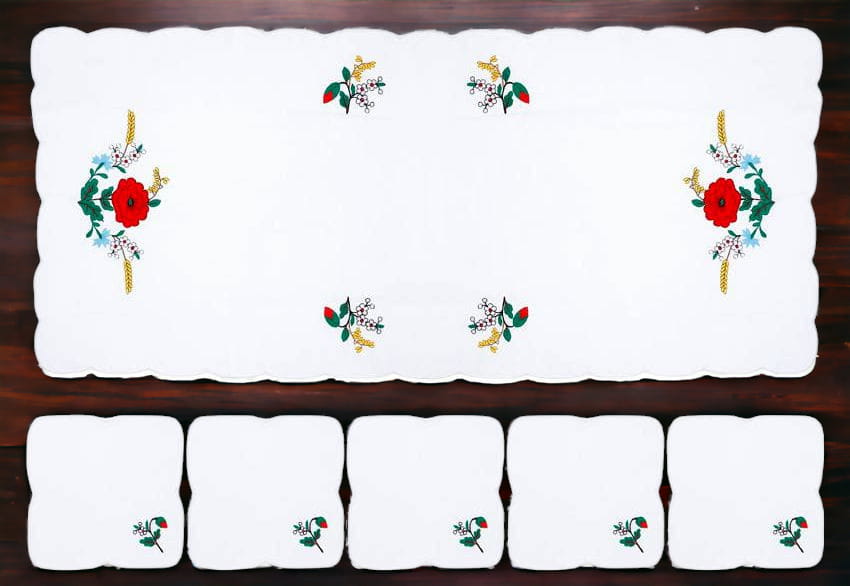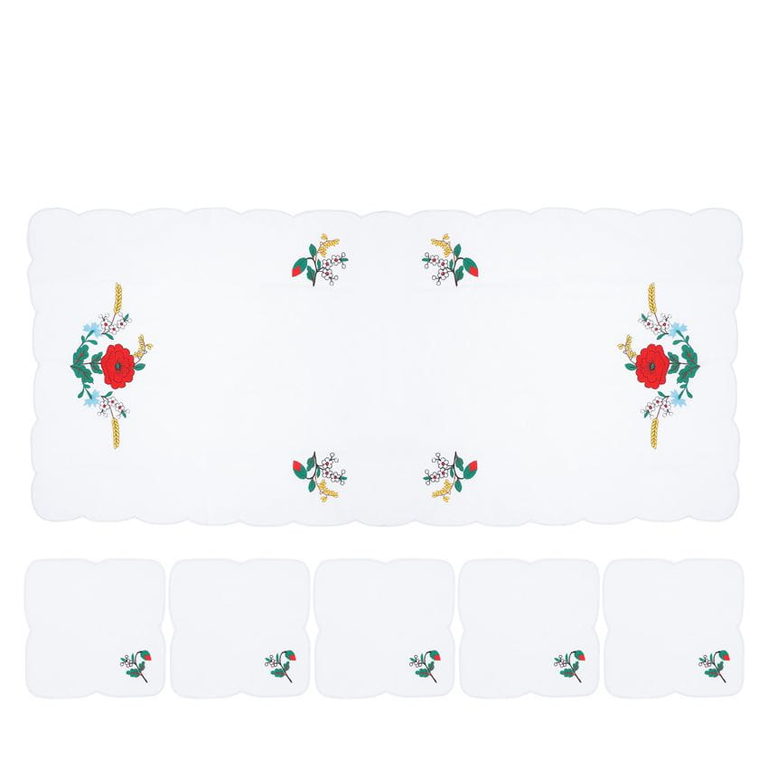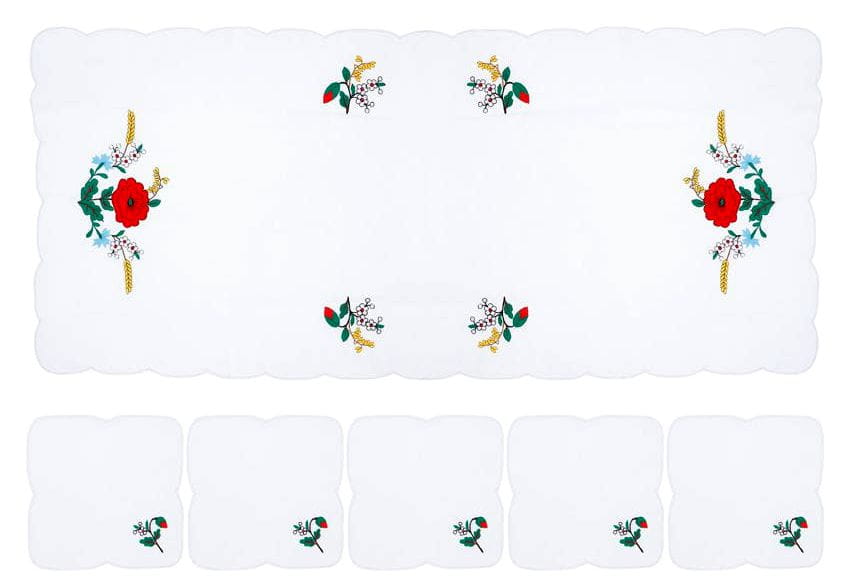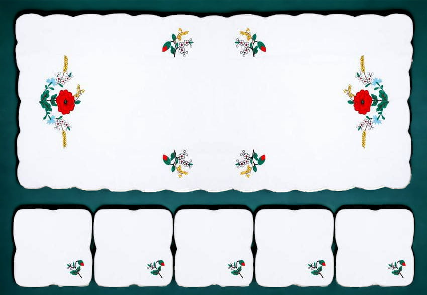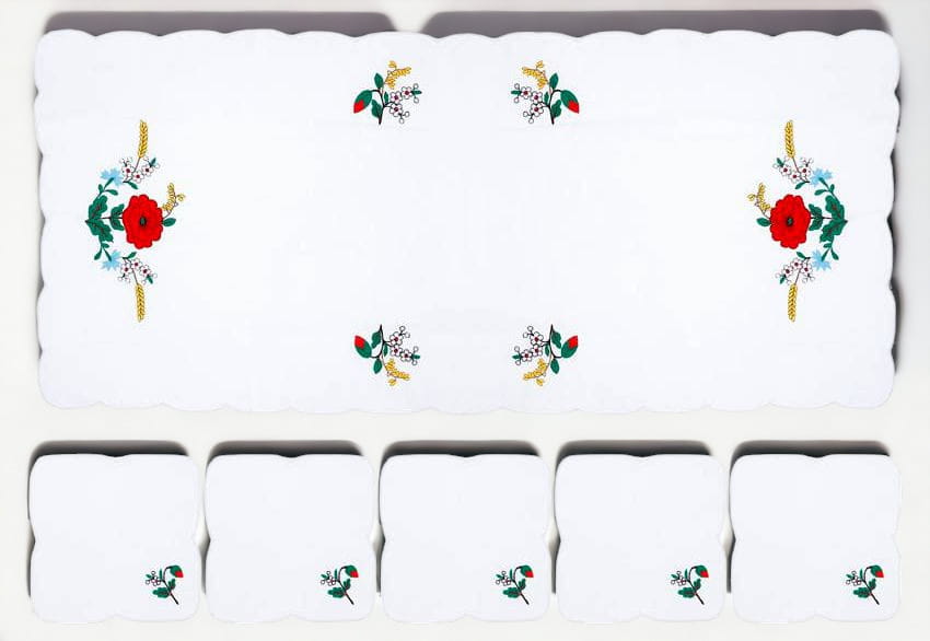 Elegancki, ręcznie haftowany komplet składający się z bieżnika z kociewskim haftem wraz z 6 serwetkami także z akcentami kociewskimi, piękna ozdoba Twojego domu, podkreślająca regionalny charakter. Haft kociewski z Pomorza nazywany jest haftem ziemi ze względu na obecność w nim dużej ilości atrybutów roślin z pól i łąk: maków, chabrów i kłosów.