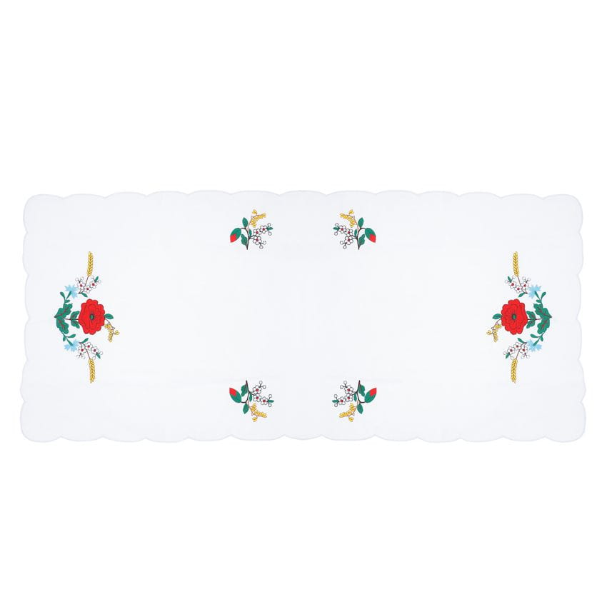 • z wyhaftowanymi wzorami haftu kociewskiego (wzór wyhaftowany na bieżniku i każdej małej serwecie),