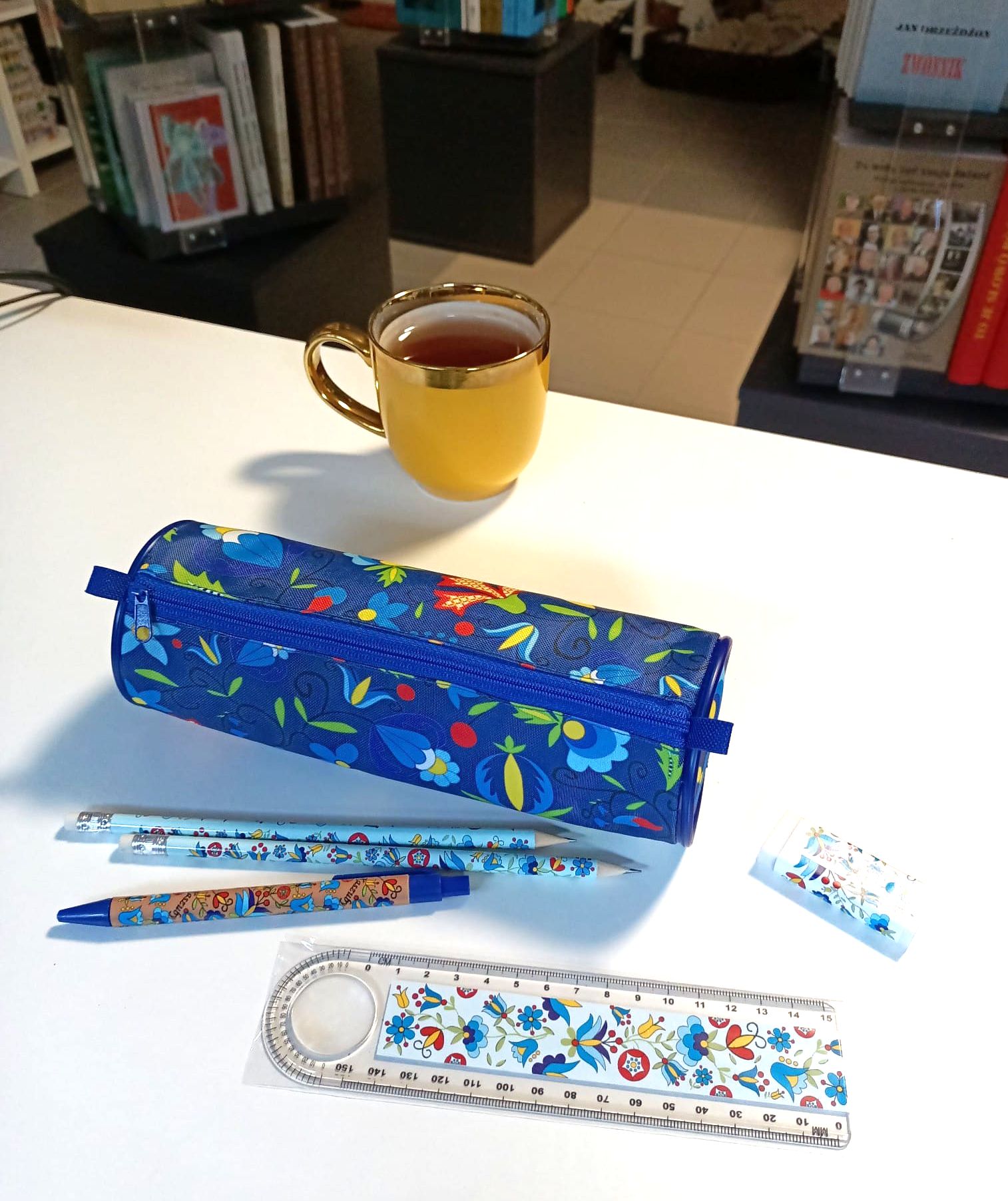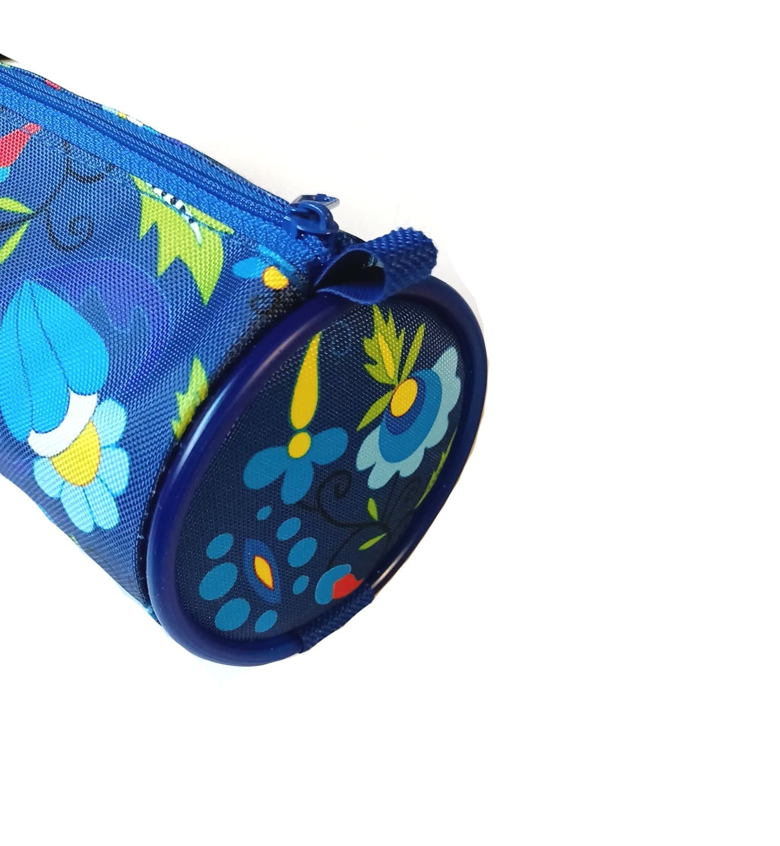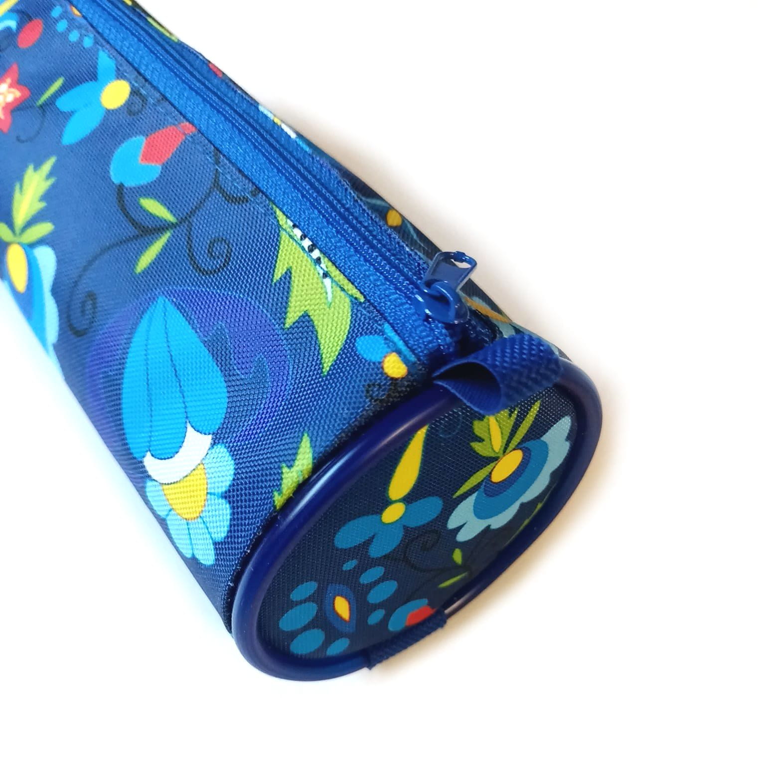 Piórnik w klasycznym kształcie tuby, z folkowym nadrukiem inspirowany tradycyjnym wzorem haftu kaszubskiego, szkoły żukowskiej.
