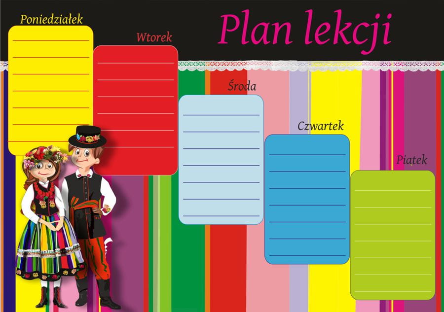 Niezbędnik każdego pilnego ucznia - piękny plan lekcji z motywem łowickim dla dzieci i młodzieży. Plan lekcji będzie piękną ozdobą szkolnego biurka lub ściany. Duży format planu zapewni czytelność rozkładu zajęć dziecka.
