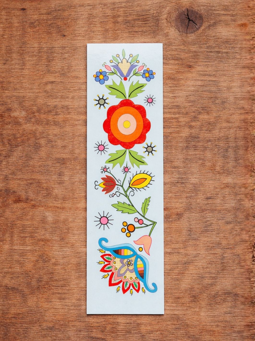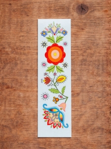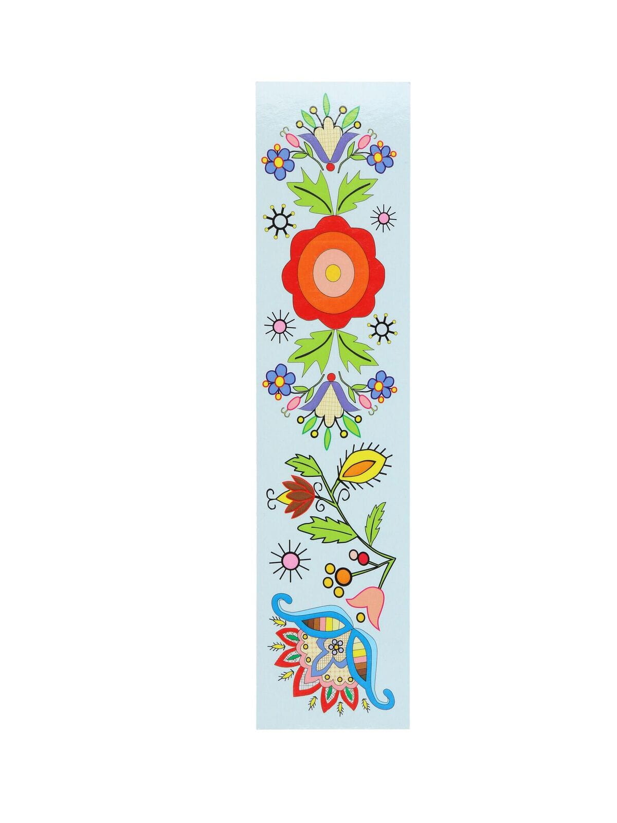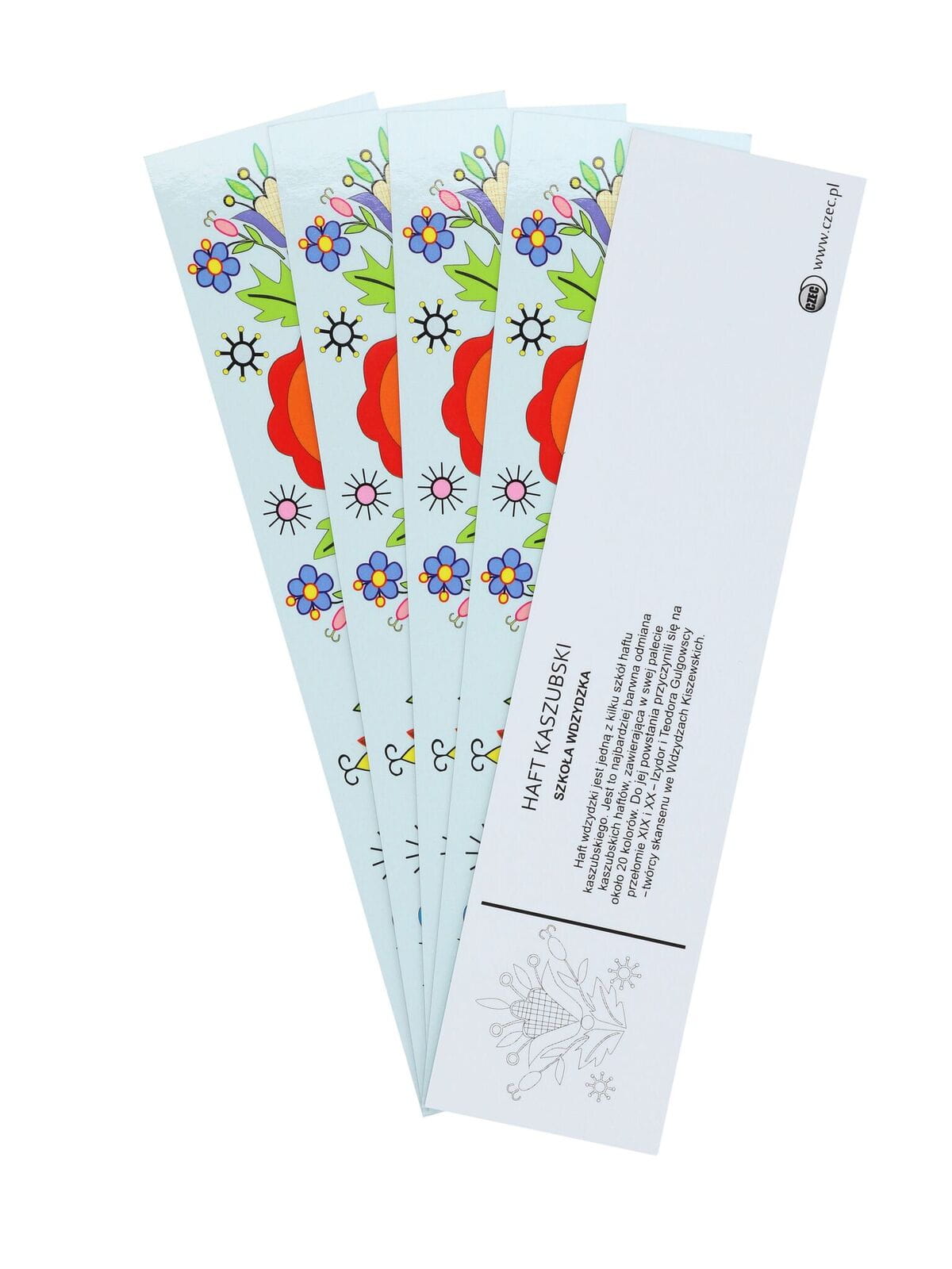 Zakładka do książki kaszubska. Jedna strona przedstawia tradycyjny haft kaszubski. Druga strona zakładki zawiera opis haftu. Idealny dodatek do kompletu z książką.