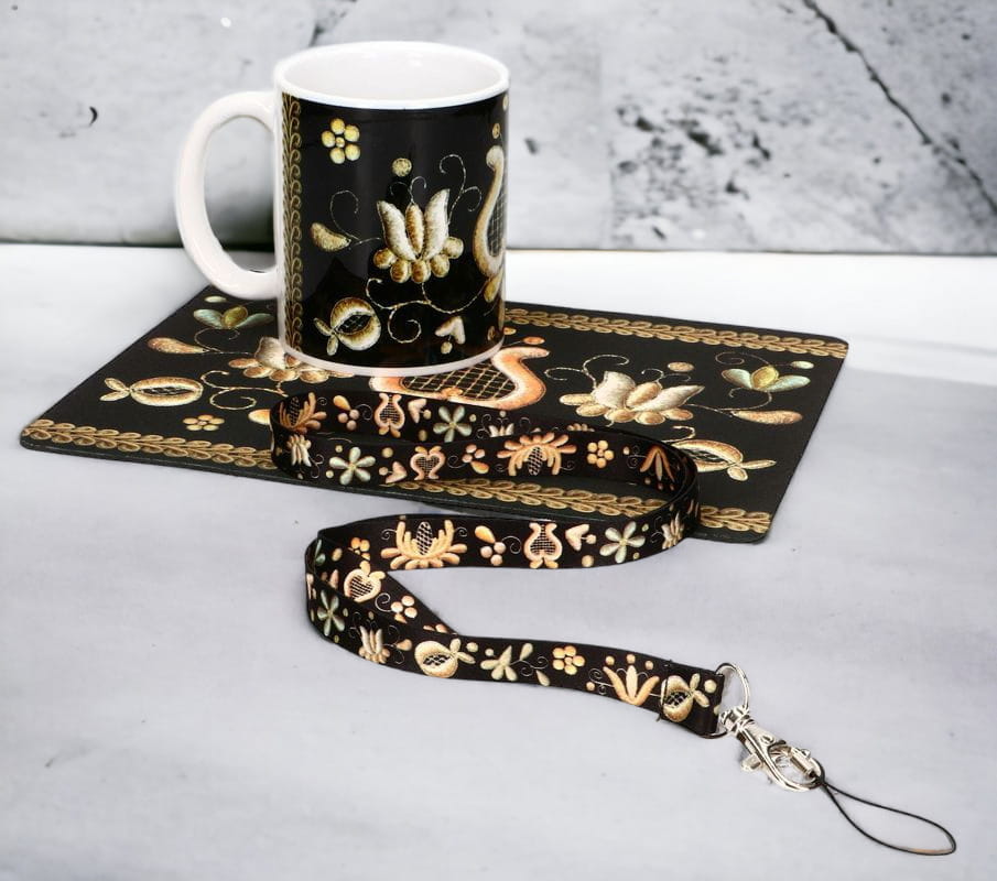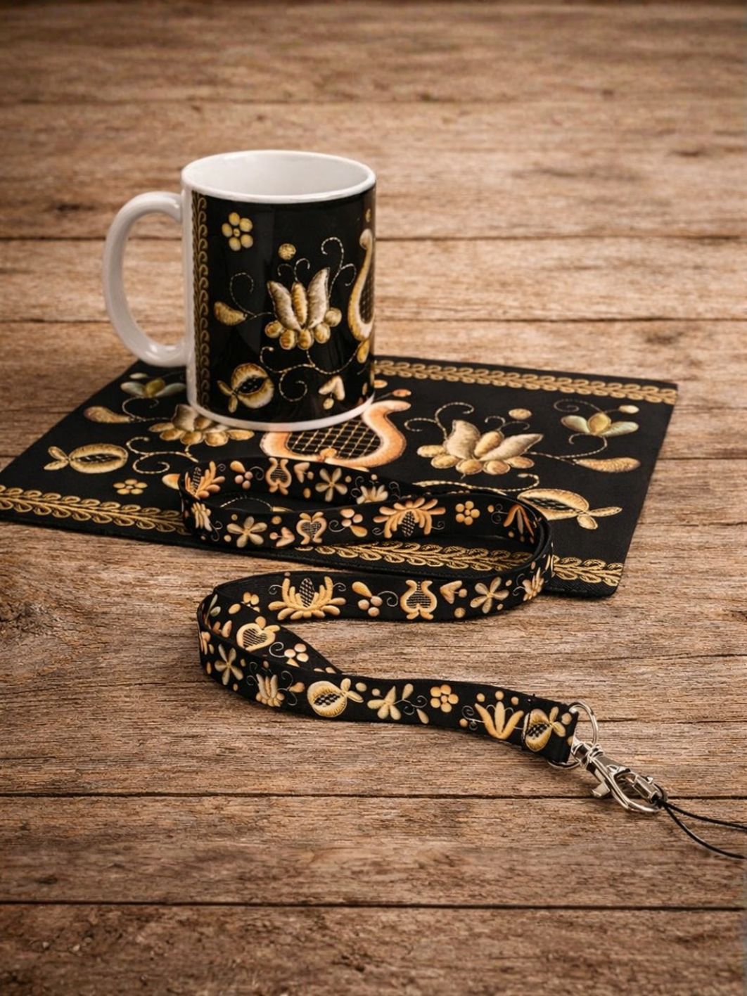 Zestaw biurowo-szkolny kaszubska złotnica to piękna kombinacja tradycji kaszubskiego haftu ludowego i praktycznych przedmiotów, które doskonale spełnią swoje funkcje zarówno w biurze, jak i szkole. Zestaw składa się z podkładki pod mysz, kubka folkowego oraz smyczy, wszystkie ozdobione charakterystycznym haftem ludowym z regionu Kaszub zwanym złotnicą.