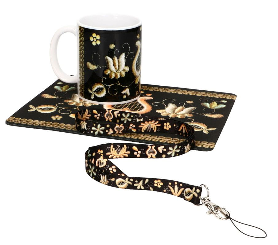 Zestaw folk kaszubski składa się z: podkładki pod mysz, kubka folkowego oraz smyczy z haftem ludowym. Całość ozdobiona haftem ludowym z Kaszub zwanym złotnicą. Zestaw świetnie sprawdza się jako prezent folk do biura, domu jak i pamiątka z Polski.