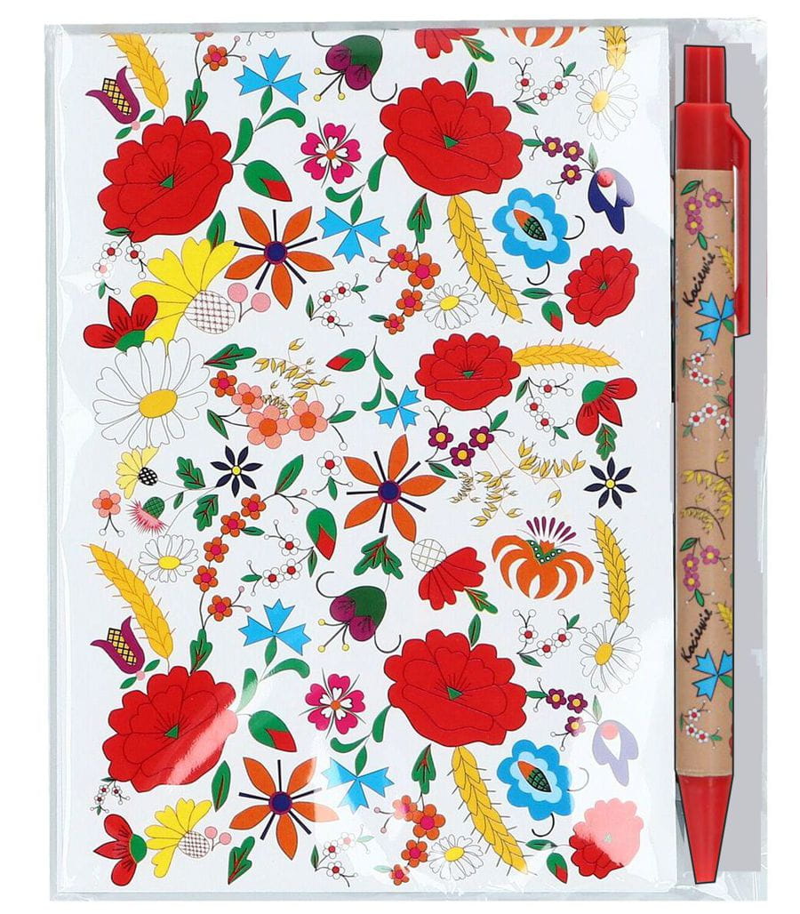 Zestaw składa się z notesu w kratkę oraz długopisu z pomarańczowym wykończeniem i kociewskim haftem. Świetna pomoc w biurze lub folkowy prezent.
