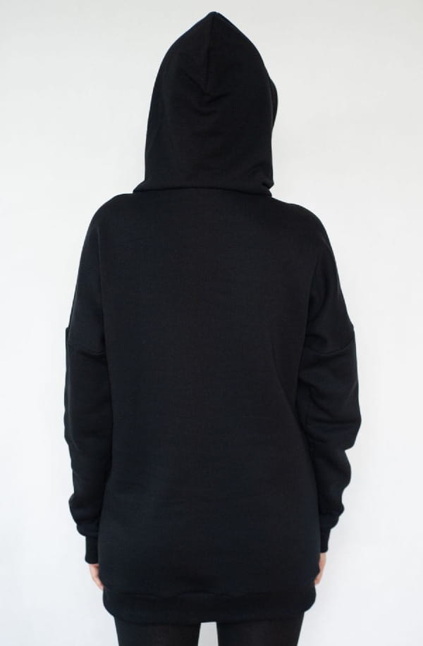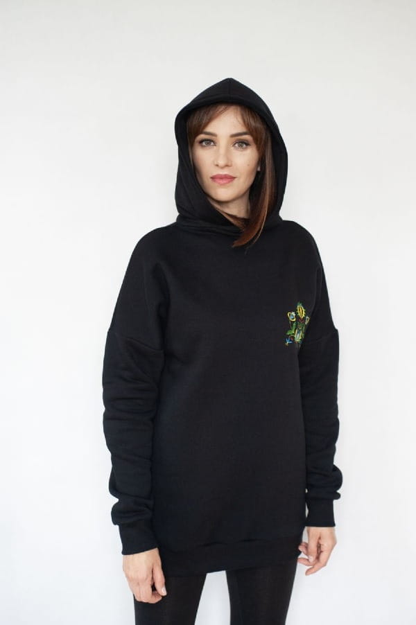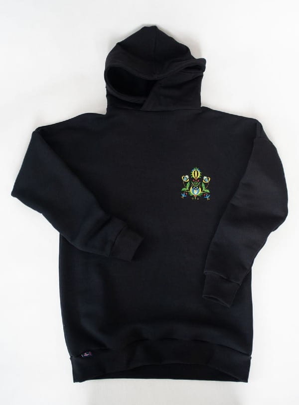Czarna bluza dresowa z kapturem uszyta została z grubej dresówki drapanej. Na przodzie bluzy znajduje się haft kaszubski. Krój lekko oversize. Wykończona ściągaczem przy rękawach i dole bluzy.