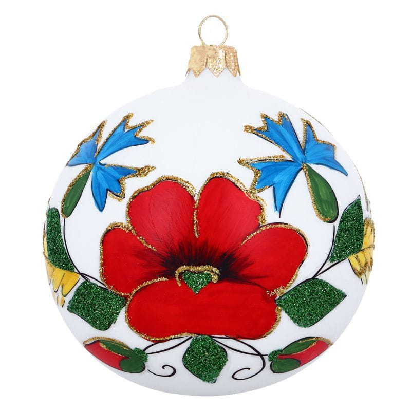 Piękna, ręcznie malowana bombka choinkowa z akcentem haftu kociewskiego. Świetny prezent na Boże Narodzenie dla wszystkich tych, którym jest bliskie Kociewie i piękne folkowe wzory. Ręcznie malowane elementy haftu kociewskiego mogą nieznacznie różnić się pomiędzy poszczególnymi egzemplarzami.