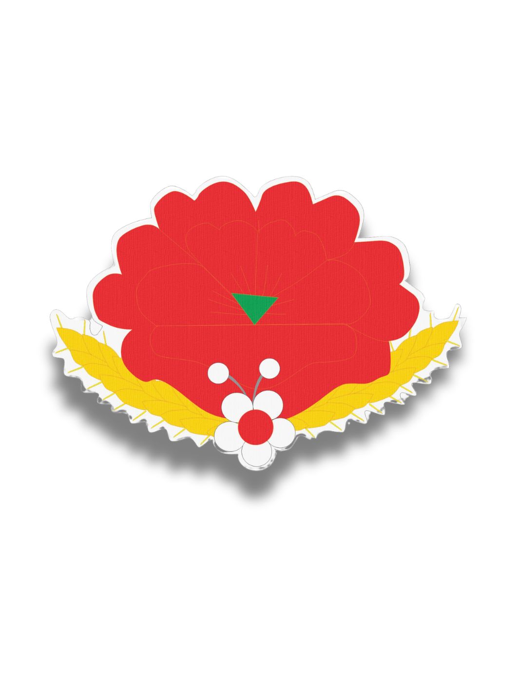 Centralnym elementem broszki jest duży czerwony kwiat z wyraźnie zaznaczonymi płatkami, akcentowany zielonym trójkątem w środku. Całość dopełniają żółte liście oraz biały kwiatuszek z czerwonym środkiem, tworząc harmonijną i pełną życia kompozycję.