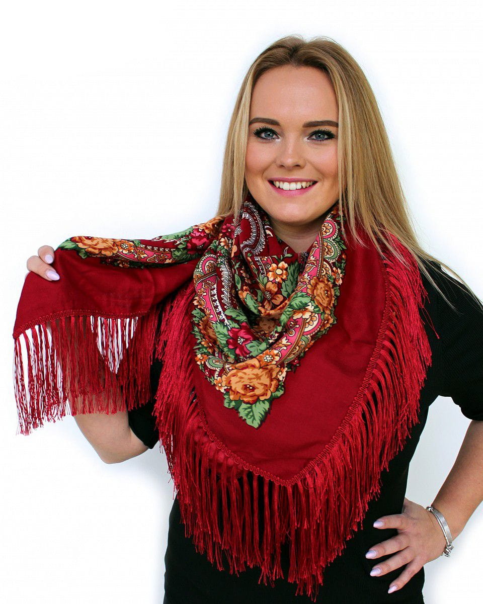 Ludowa chusta zdobiona kwiatami uszyta w kwadratowy kształt, który można dowolnie złożyć i wiązać. Można nosić ją na szyi oraz na plecach. Chusty ludowe są nieodłącznym elementem kobiecego stroju ludowego we wszystkich regionach Polski.
