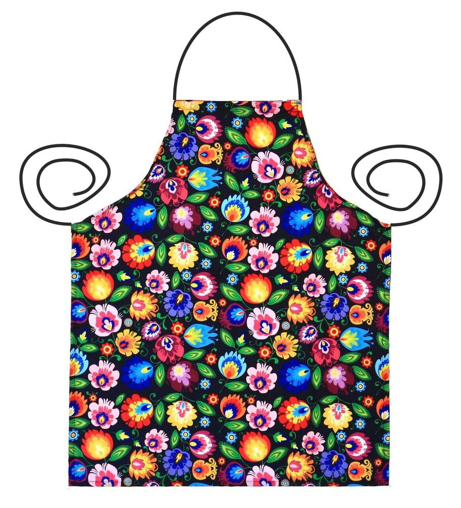 Fartuszek kuchenny z motywem kwiatów łowickich, w kolorze czarnym, to elegancki i funkcjonalny element wyposażenia kuchni.