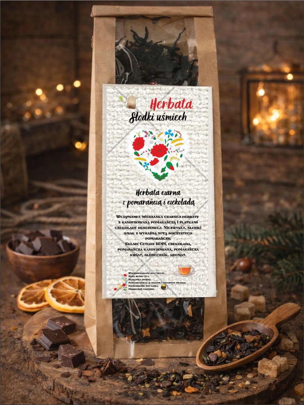 Herbata „Słodki Uśmiech” to wyjątkowa kompozycja czarnej herbaty, kandyzowanej pomarańczy i płatków czekolady deserowej. Jej słodko-cytrusowy aromat sprawia, że każdy łyk przynosi rozkoszne ciepło i ukojenie. Idealna na chłodne wieczory oraz jako prezent dla miłośników wyjątkowych smaków.