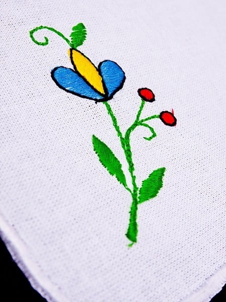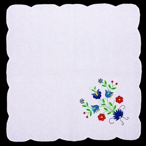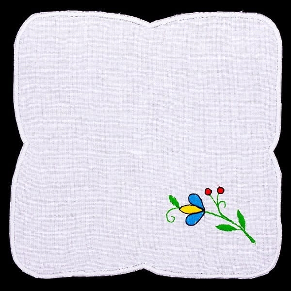 Tradycyjna serweta z pięknym haftem kaszubskim. Wykonana z białego lnu. Części haftu wykonane są nićmi z zawartością wiskozy, które nadają efekt delikatnego połysku. Cena dotyczy kompletu: jednej dużej serwety z sześcioma małymi serwetkami.