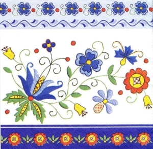 Paczka zawiera 20 szt. Trójwarstwowe serwetki papierowe z kolorowym nadrukiem kaszubskich wzorów.