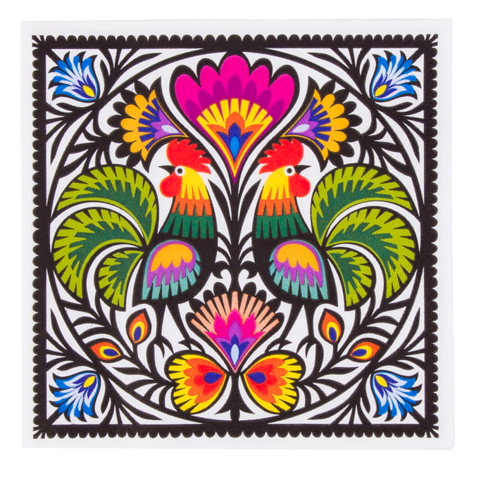 Paczka zawiera 20 szt. Serwetki, są trójwarstwowe z kolorowym nadrukiem folk ludowych wycinanek łowickich. Świetnie nadają się jako nakrycie do stołu, wykorzystywane są również przez artystów do decoupage.