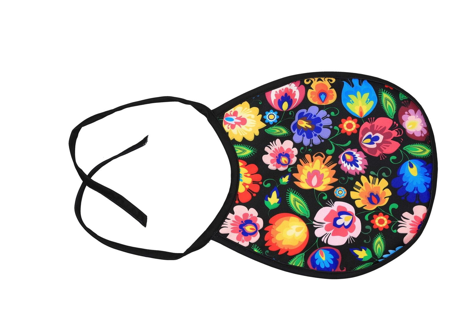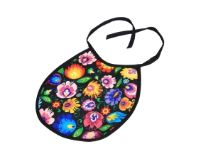 Śliniaczek dziecięcy łowicki. Wykonany jest z delikatnej, nieprzemakalnej tkaniny. Wewnątrz obszyty delikatną flizeliną. Starannie wykończony czarną lamówką. Wiązany na szyjce niemowląt oraz większych dzieci.