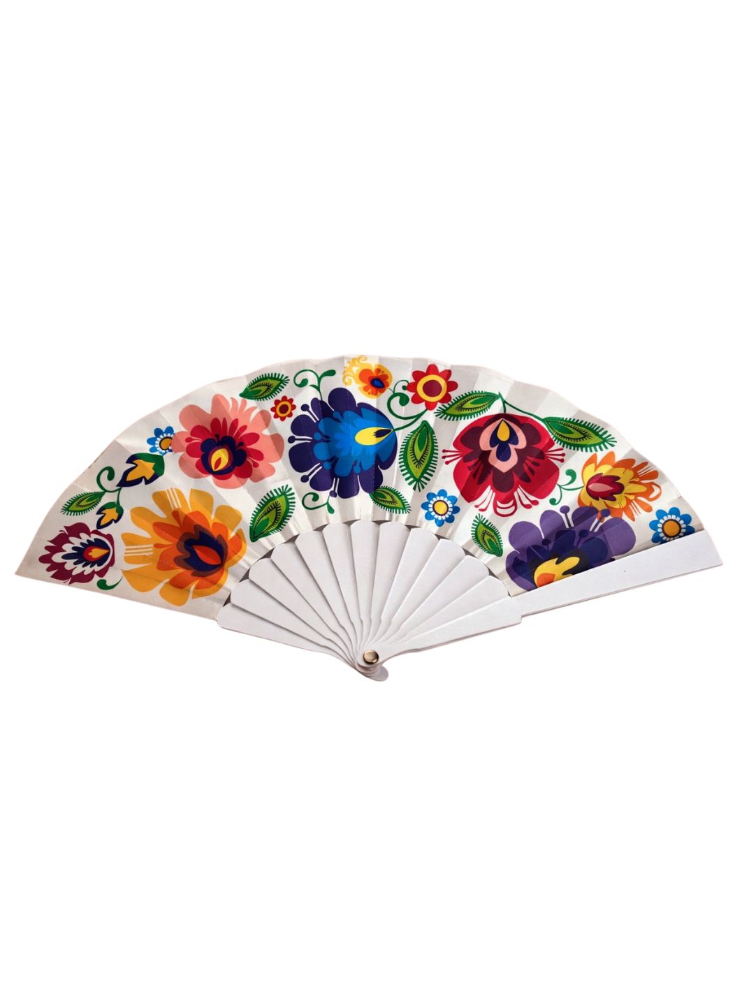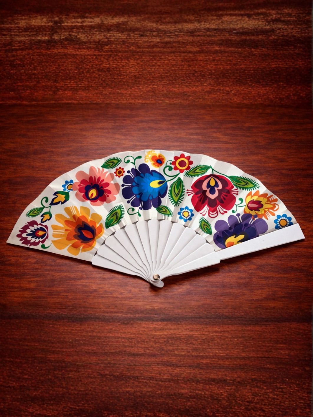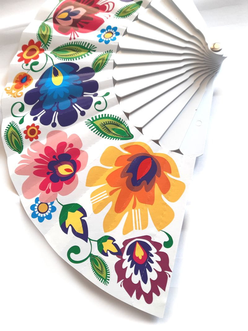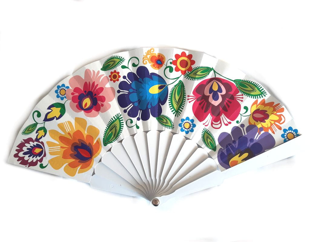 Wzór łowicki zdobiący wachlarz jest nie tylko estetyczny, ale także pełen życia i radości, charakterystycznych dla tej formy sztuki ludowej. Jego żywe kolory i dynamiczne linie czynią ten wachlarz niepowtarzalnym i przyciągającym wzrok akcentem, który można nosić ze sobą wszędzie.