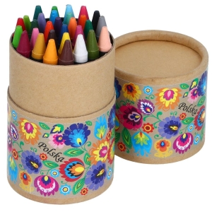 Łowicki zestaw kredek woskowych dla dzieci składa się z 30 kredek woskowych pakowanych w papierową tubę z recyclingu.
