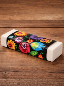 Gumka została owinięta papierową opaską z folkowym wzorem, która podkreśla jej estetykę i regionalne inspiracje. Poręczny rozmiar sprawia, że wygodnie mieści się w piórniku lub na biurku, a dobre właściwości ścierające pozwalają skutecznie usuwać ślady ołówka.