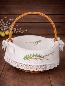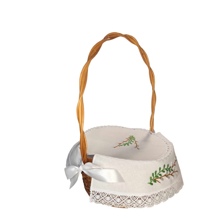 Ta elegancka serwetka do koszyczka wielkanocnego została ozdobiona ręcznie prowadzonym haftem w postaci gałązek bazi z zielonymi listkami, co nadaje jej wyjątkowo świeży i wiosenny charakter. Koronkowe wykończenie oraz satynowe wstążki dodają całości subtelnej, świątecznej elegancji.