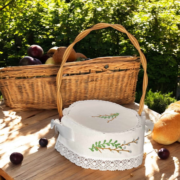 Podkreśl piękno tradycji wielkanocnej z ręcznie haftowaną serwetką – naturalny motyw bazi, świeżość zieleni i eleganckie wykończenie sprawią, że Twój koszyczek zachwyci.