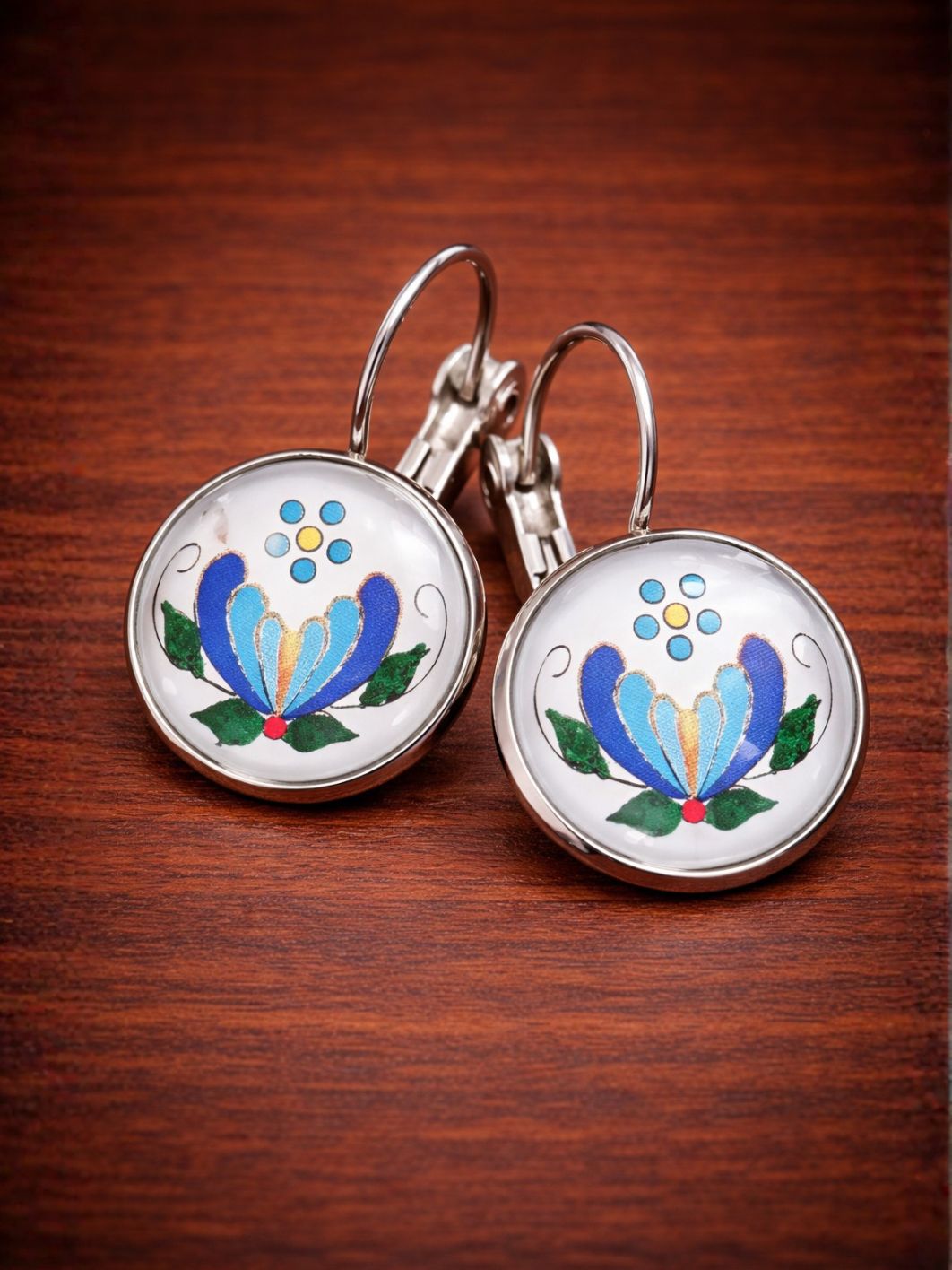 Kolczyki „Kaszubska Palmeta” to biżuteria inspirowana klasycznym haftem kaszubskim – jednym z najstarszych i najbardziej rozpoznawalnych elementów polskiego folkloru. Kwiat palmeta, symbolizujący życie, rozwój i harmonię, został wiernie odwzorowany w formie graficznej i zamknięty pod szklaną soczewką, która nadaje blask i głębię detalu.