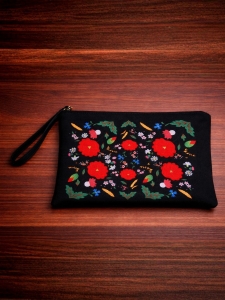 Stylowa kosmetyczka inspirowana tradycyjnymi wzorami ludowymi. Czarne tło pięknie podkreśla intensywne czerwone kwiaty, otoczone barwnymi, roślinnymi detalami. To idealny dodatek dla miłośników folkowych akcentów w codziennym stylu!