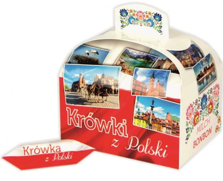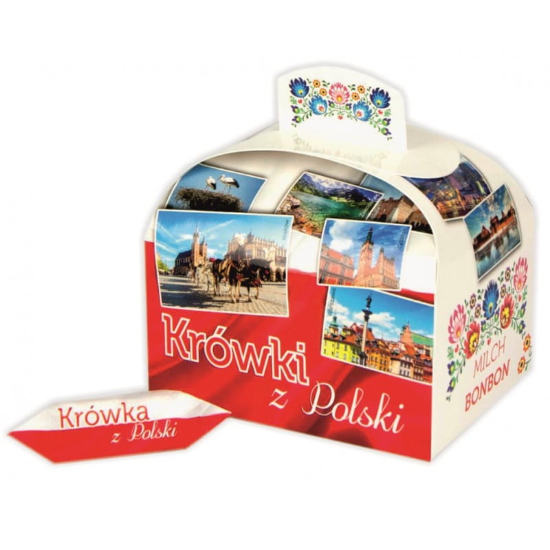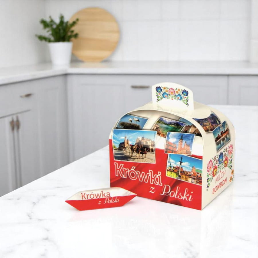 Wspaniały, niesamowicie pyszny upominek z Polski. Zapakowana w piękny kartonik bogato zdobiony łowickimi wzorami. Krówki o smaku śmietankowym zapakowane w papierki ze wzorem folk.