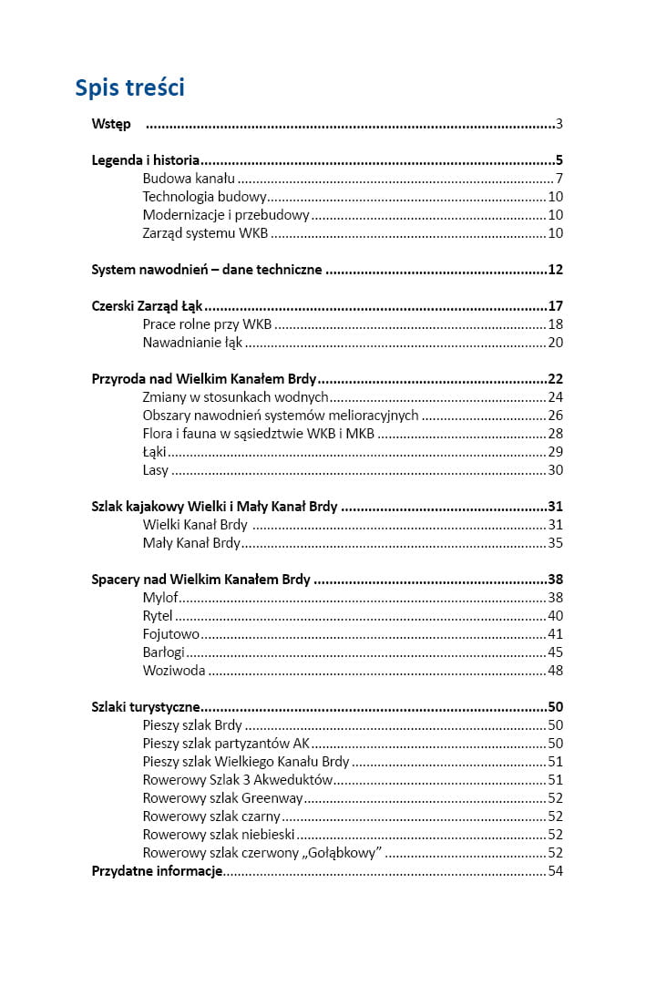 Unikatowy w skali Europy system nawadniania łąk w Borach Tucholskich powstał w 1849 roku. Mimo upływu ponad 150 lat system wciąż działa, choć jego funkcja uległa zasadniczej zmianie – dziś jest to przede wszystkim atrakcja turystyczna i doskonały szlak kajakowy. Czwarte wydanie popularnego przewodnika umożliwi zainteresowanym bliższe poznanie Wielkiego i Małego Kanału Brdy, ułatwi samodzielne odkrywanie tajemnic obu tych systemów hydrologicznych, a także zaprezentuje najciekawsze trasy turystyczne zarówno lądowe, jak i wodne.