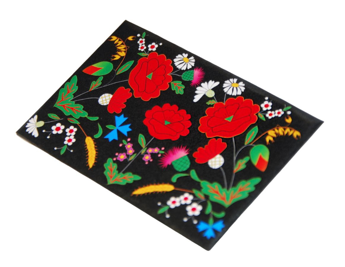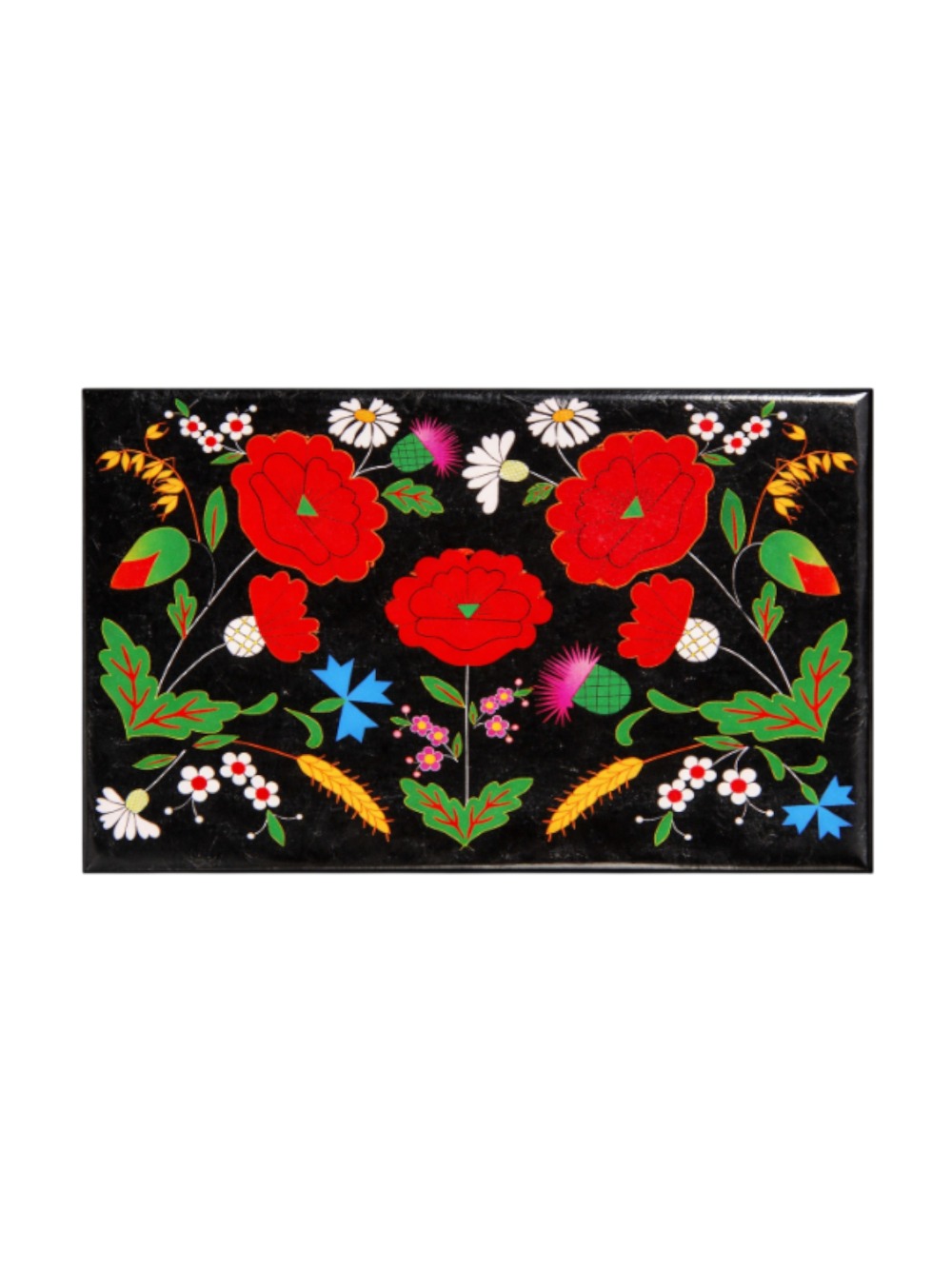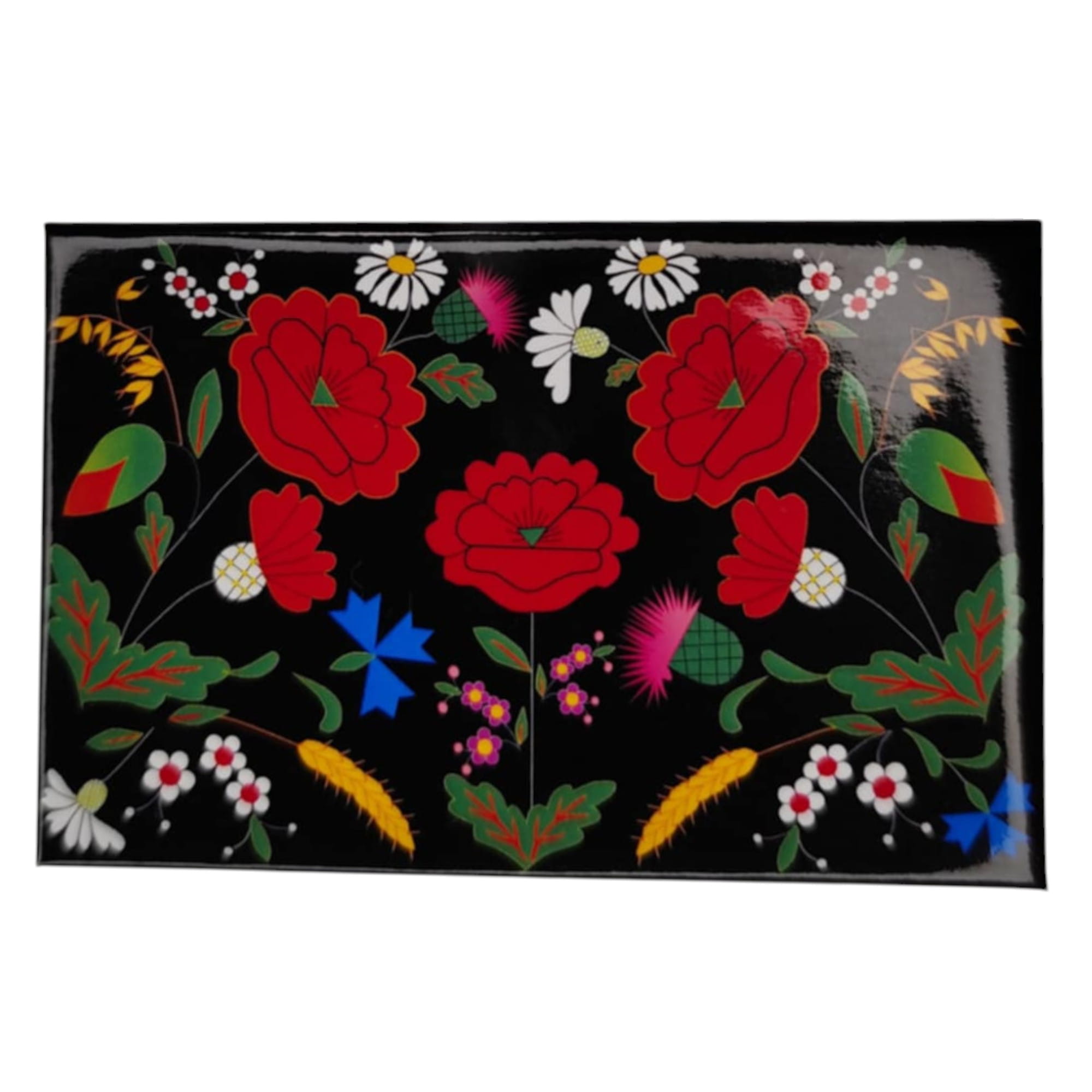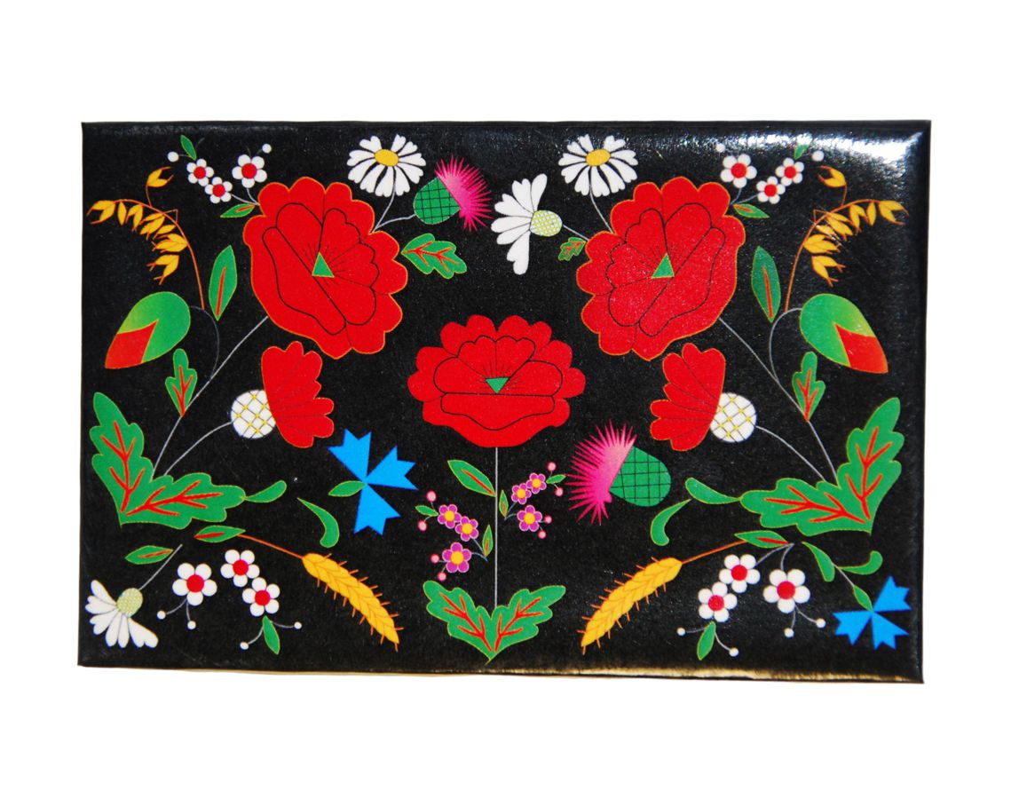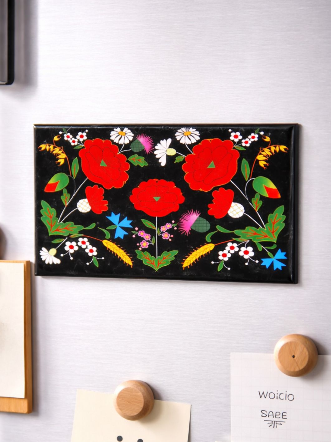 Odkryj urok haftu kociewskiego dzięki wyjątkowemu magnesowi na lodówkę. Żywe kolory na kontrastowym, czarnym tle tworzą niebanalną kompozycję, która przyciąga wzrok i wprowadza do wnętrza klimat regionalnej tradycji.