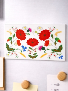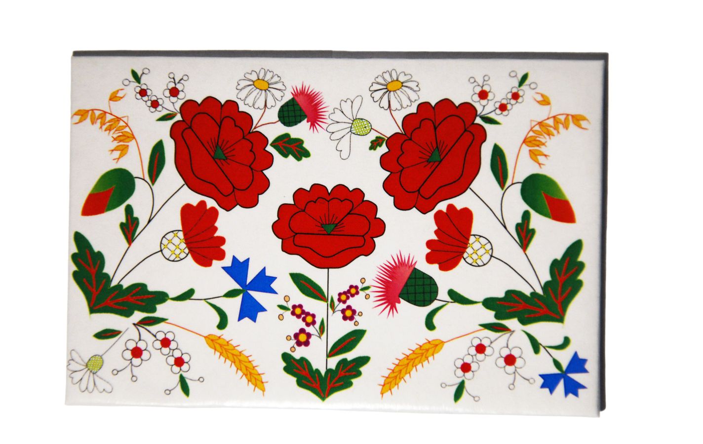 Magnes inspirowany tradycyjnym haftem kociewskim zachwyca intensywnymi barwami i delikatnym wzorem ludowym, osadzonym na jasnym tle. To nie tylko funkcjonalna ozdoba, ale również wyraz przywiązania do kultury regionu.