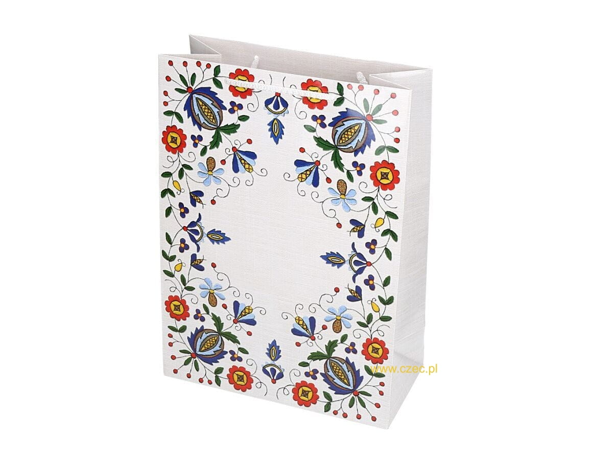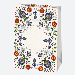 Torba wykonana jest z solidnego papieru i pokryta nabłyszczaną folią, dzięki czemu efektownie odbija światło, podkreślając ludowe wzory. Świetnie sprawdzi się jako opakowanie na prezent na różne okazje – urodziny, święta, jubileusze, a także wydarzenia o charakterze regionalnym i kulturalnym.