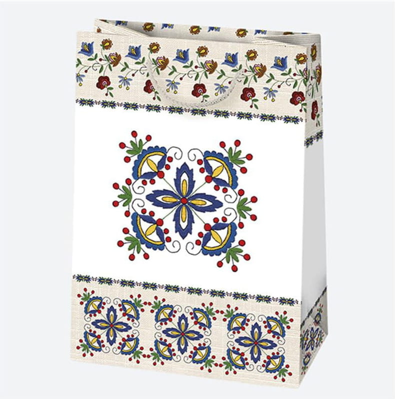 Ozdobna torba prezentowa inspirowana szkołą wdzydzką haftu kaszubskiego to elegancka i pełna kulturowej głębi oprawa dla każdego prezentu. Nadruk bazuje na unikalnych wzorach ludowych, których korzenie sięgają początków XX wieku, gdy Teodora i Izydor Gulgowscy – założyciele Muzeum Kaszubskiego we Wdzydzach – rozpropagowali kaszubskie rękodzieło.