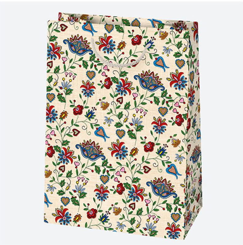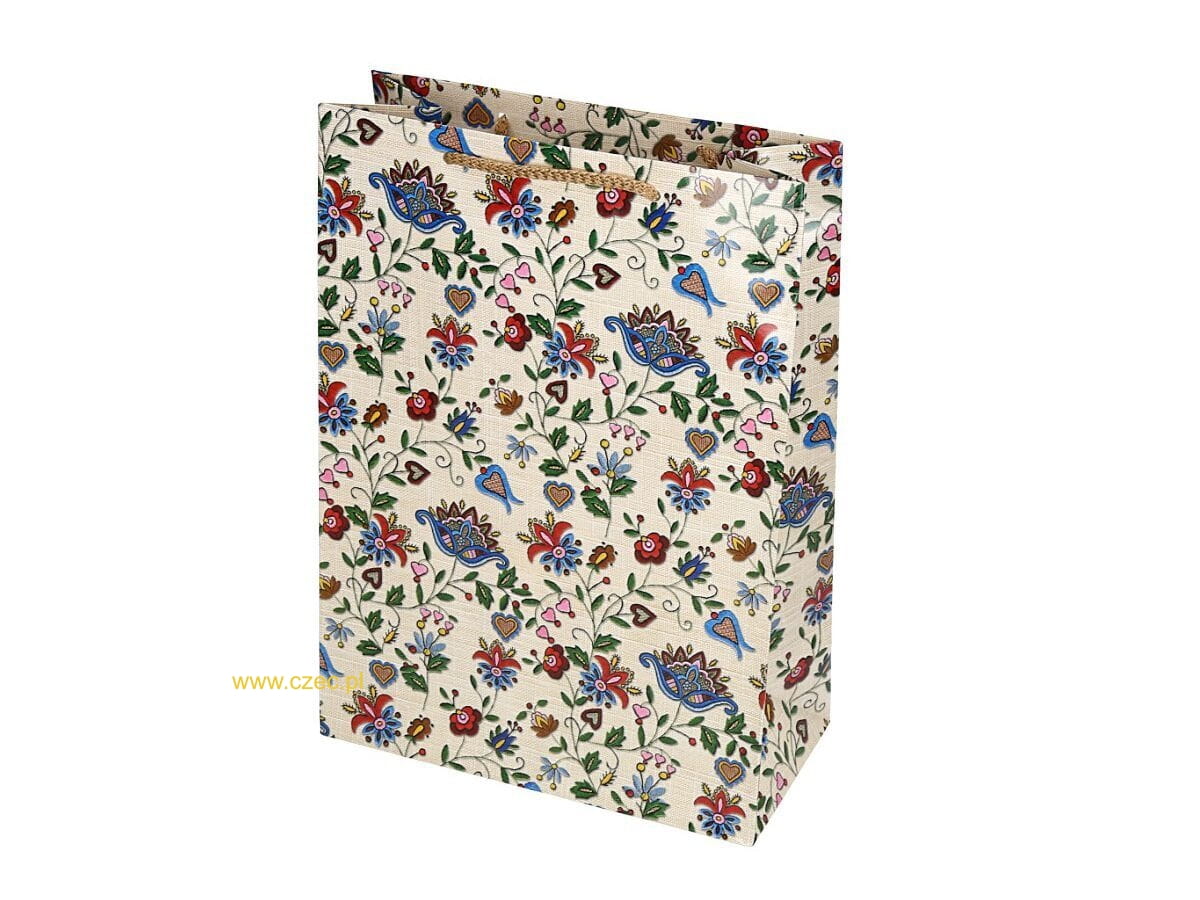 Torba została wykonana z wytrzymałego papieru i pokryta nabłyszczaną folią, dzięki czemu efektownie się prezentuje i podkreśla ludowy charakter nadruku. Powstała na Pomorzu – idealna jako regionalne opakowanie na prezent, które wyróżnia się nie tylko wyglądem, ale i wartością kulturową.