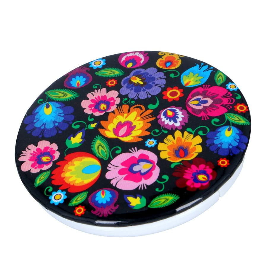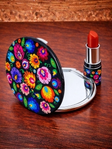 Świetny, praktyczny folk gadżet w ludowym, folkowym stylu. Wewnątrz znajdują się dwa lusterka. Bez problemu mieści się nie tylko w torebce, ale nawet niewielkiej kieszonce i w spodniach. Zdobione wzorami łowickimi.