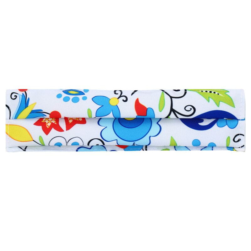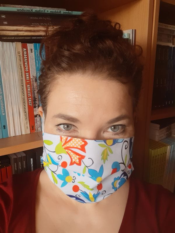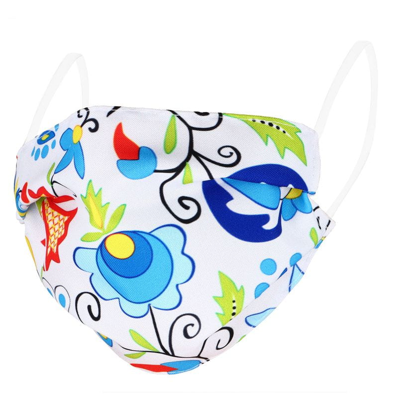 Wygodna maseczka ochronna wielokrotnego użytku na czas pandemii, zdobiona kaszubskim akcentem ludowym. Zewnętrzna warstwa z wzorem kaszubskim wykonana z materiału o gramaturze 160 g. Wewnętrzna część wykonana z podwójnej warstwy fizeliny o gramaturze 40 g. Maseczka ochronna na twarz
