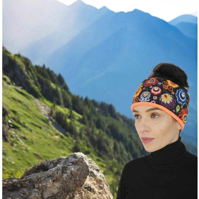 Piękna łowicka opaska na głowę na zimę. Opaska została uszyta z wysokiej jakości bawełny z motywem łowickim na czarnym tle oraz mięciutkiego i ciepłego polaru w kolorze czarnym. Idealnie nadaje się na spacer, bieganie czy też morsowanie. Opaska będzie ciekawym folkowym wykończeniem zimowej stylizacji.