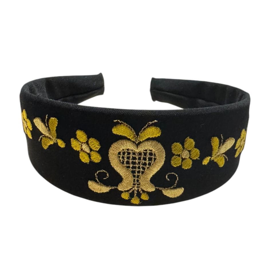 Wyjątkowa opaska na głowę, ozdobiona tradycyjnym haftem kaszubskim w technice złotnicy, haftowana na czarnej tkaninie przez uznaną twórczynię ludową. Ta technika, uważana za najtrudniejszą metodę haftu kaszubskiego, łączy precyzję z niepowtarzalnym pięknem, czyniąc opaskę eleganckim dodatkiem na różne okazje.