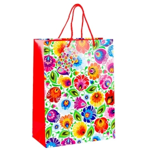 Duża ozdobna torebka prezentowa w rozmiarze L z motywem kwiatów łowickich to idealna oprawa każdego prezentu w stylu folk. Wykonana ze sztywnego, błyszczącego papieru, zdobiona z obu stron wyrazistą, kolorową wycinanką ludową. Boki torebki wykończone są w intensywnym czerwonym kolorze, co dodaje całości wyrazistości i kontrastu.