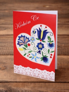 Kartka folk kaszubski - Kòchóm Ce. Kartka z kolorowym wzorem inspirowanym motywem kaszubskim. Zadrukowana jest na zewnątrz, wnętrze bez zadruku specjalnie na indywidualne życzenia. W komplecie: kartka z kopertą w kolorze białym. Całość w kaszubskich barwach ludowych z Kaszub.
