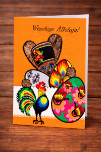 Wesołego Alleluja - kurpiowska kartka wielkanocna. W komplecie: kartka z kopertą w kolorze białym. Całość w niezwykle barwnych, polskich wzorach ludowych z regionu kurpiowskiego.
