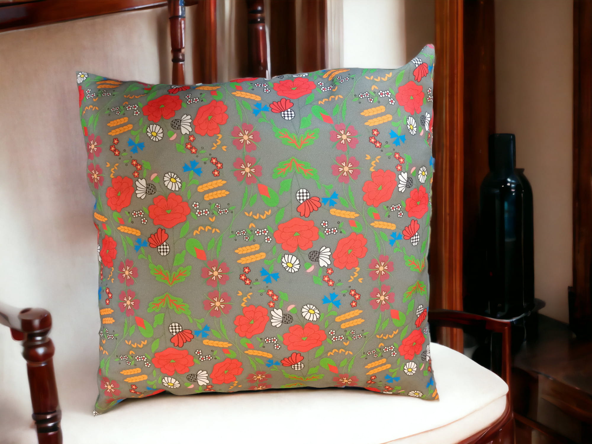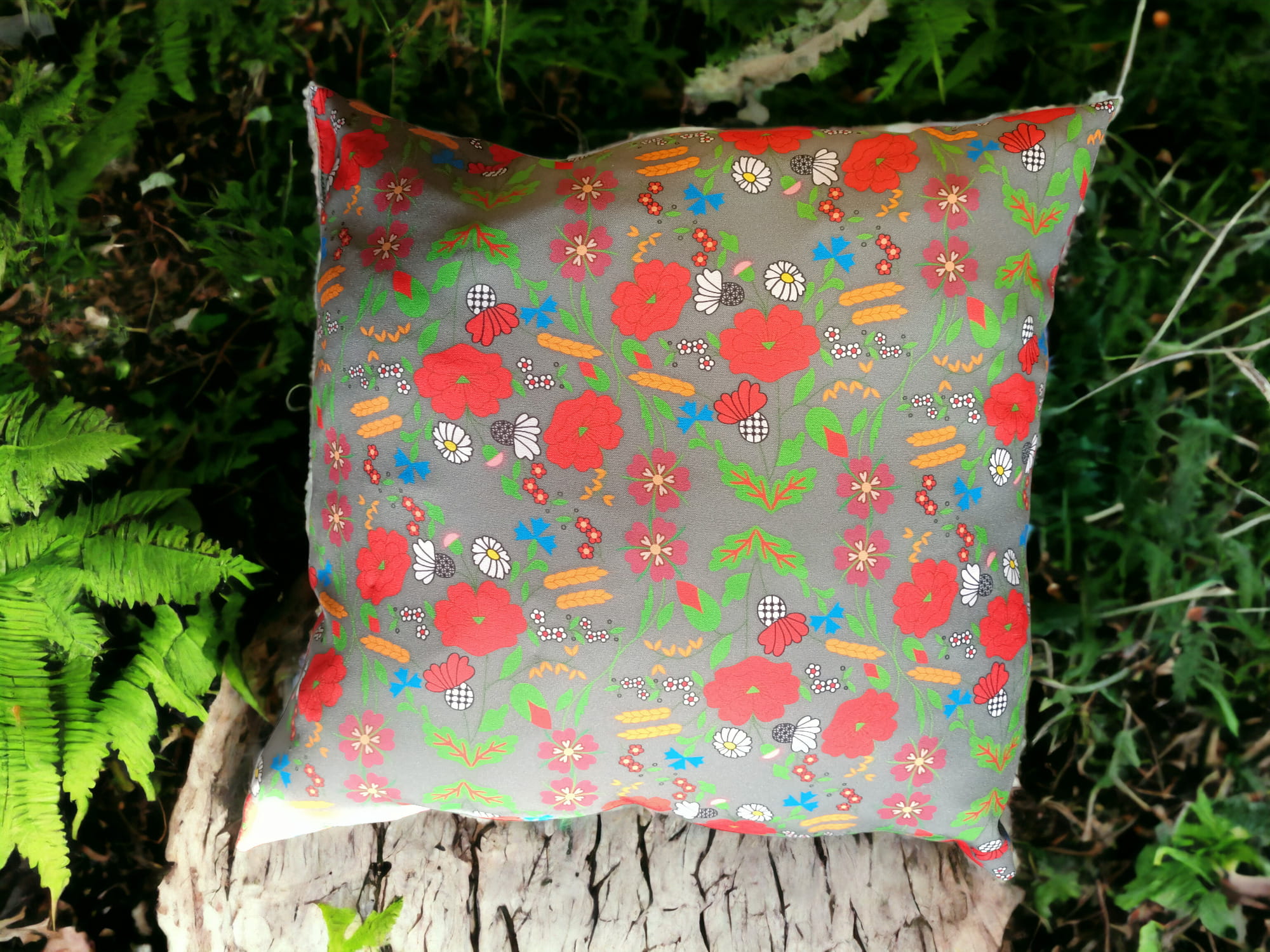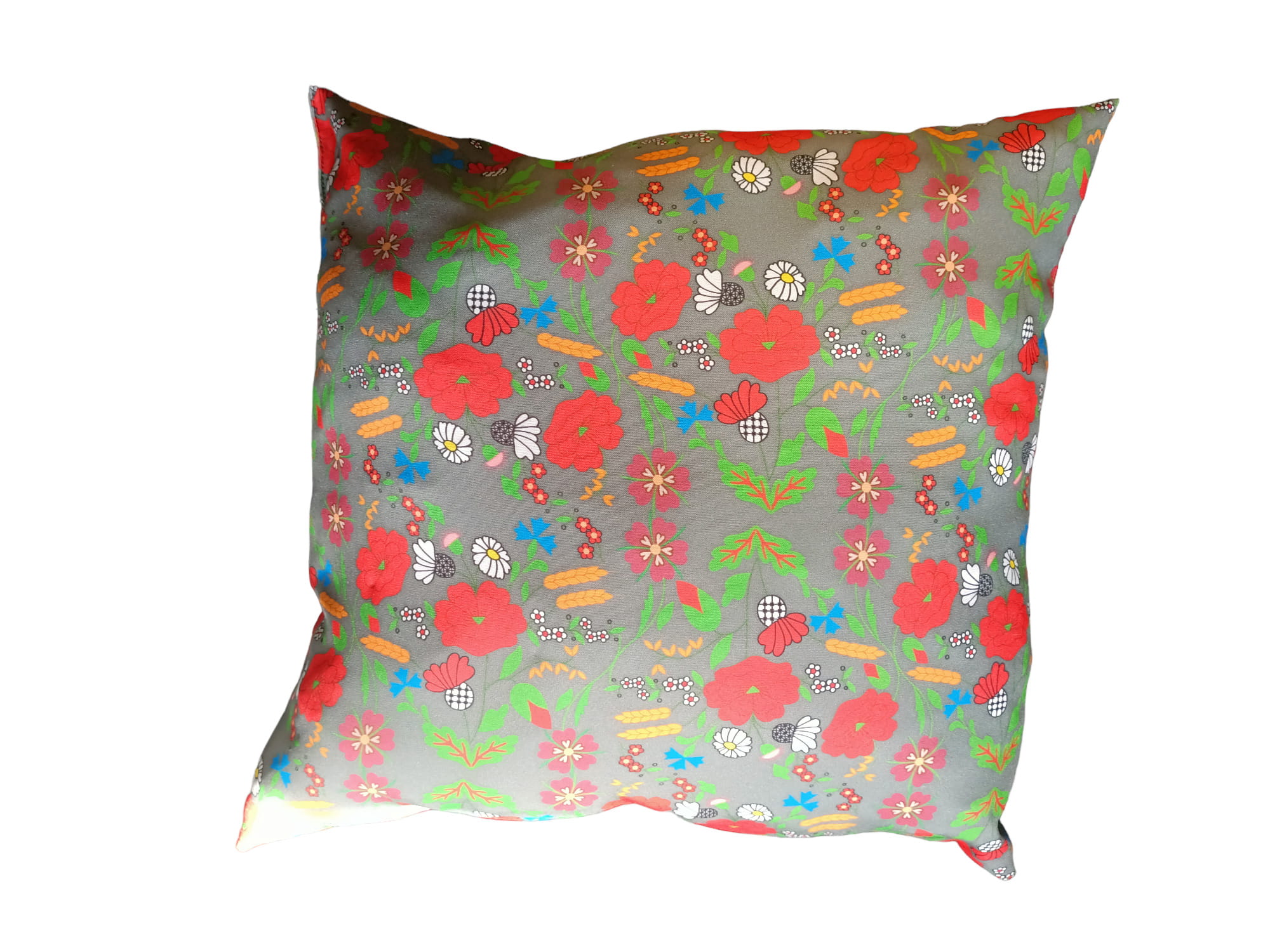 Poduszka inspirowana ludowym motywem kwiatów kociewskich, nadruk dwustronny. Poduszka wykonana jest z wysokogatunkowej tkaniny poliestrowej o gramaturze 160 g.