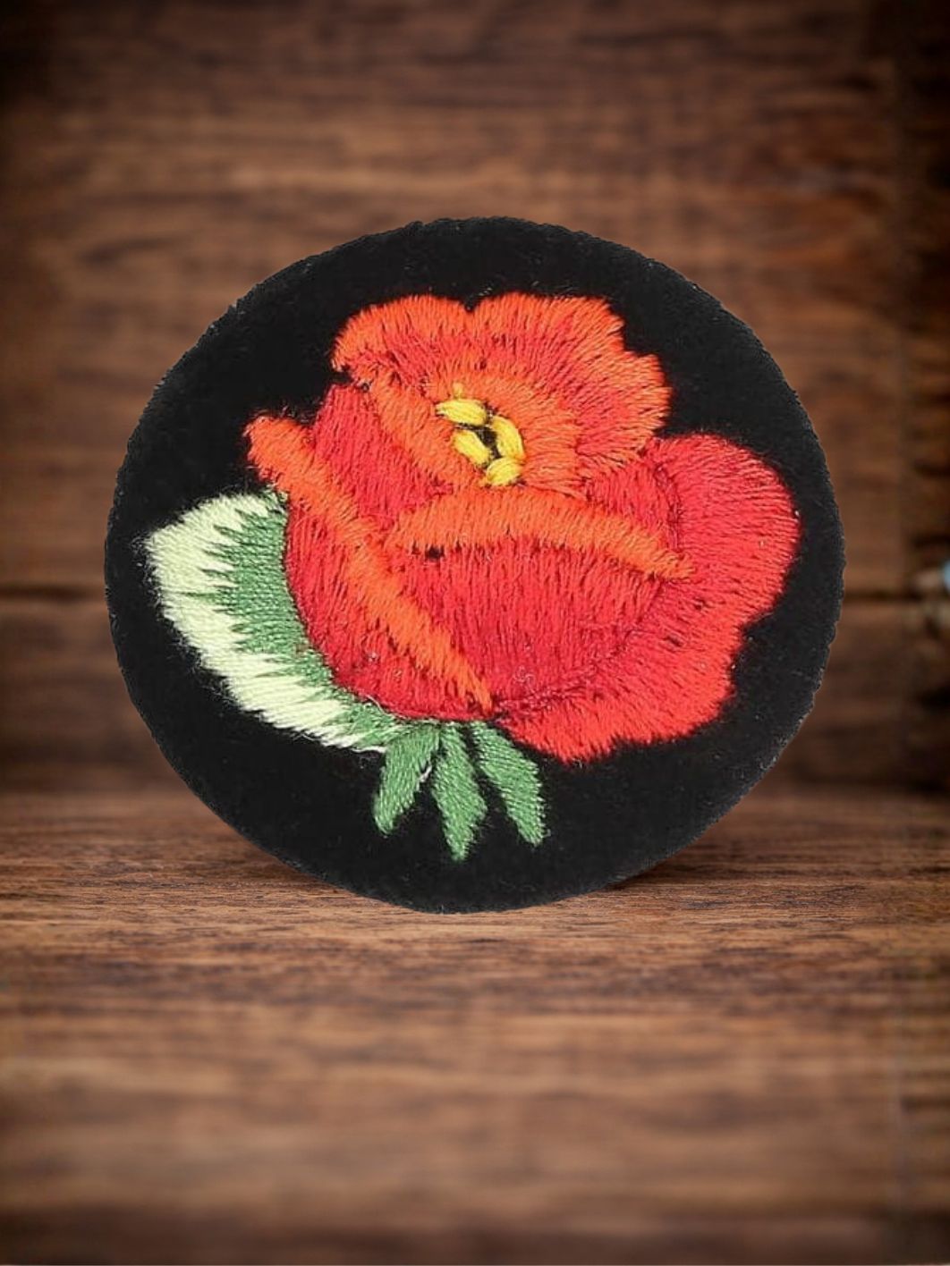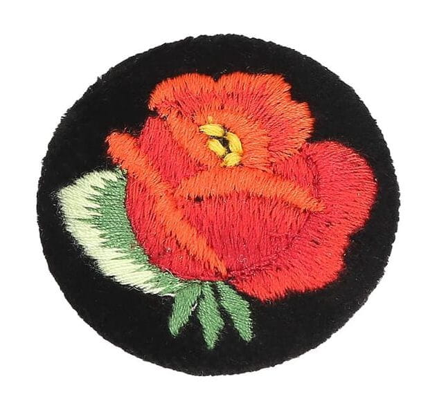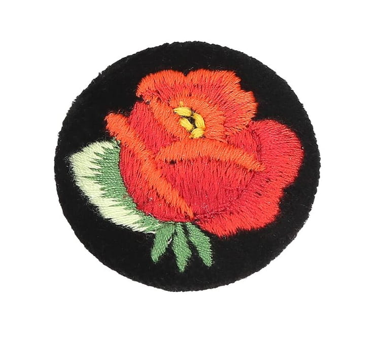 Przypinka z haftem łowickim z czerwoną różą (na czarnym tle)