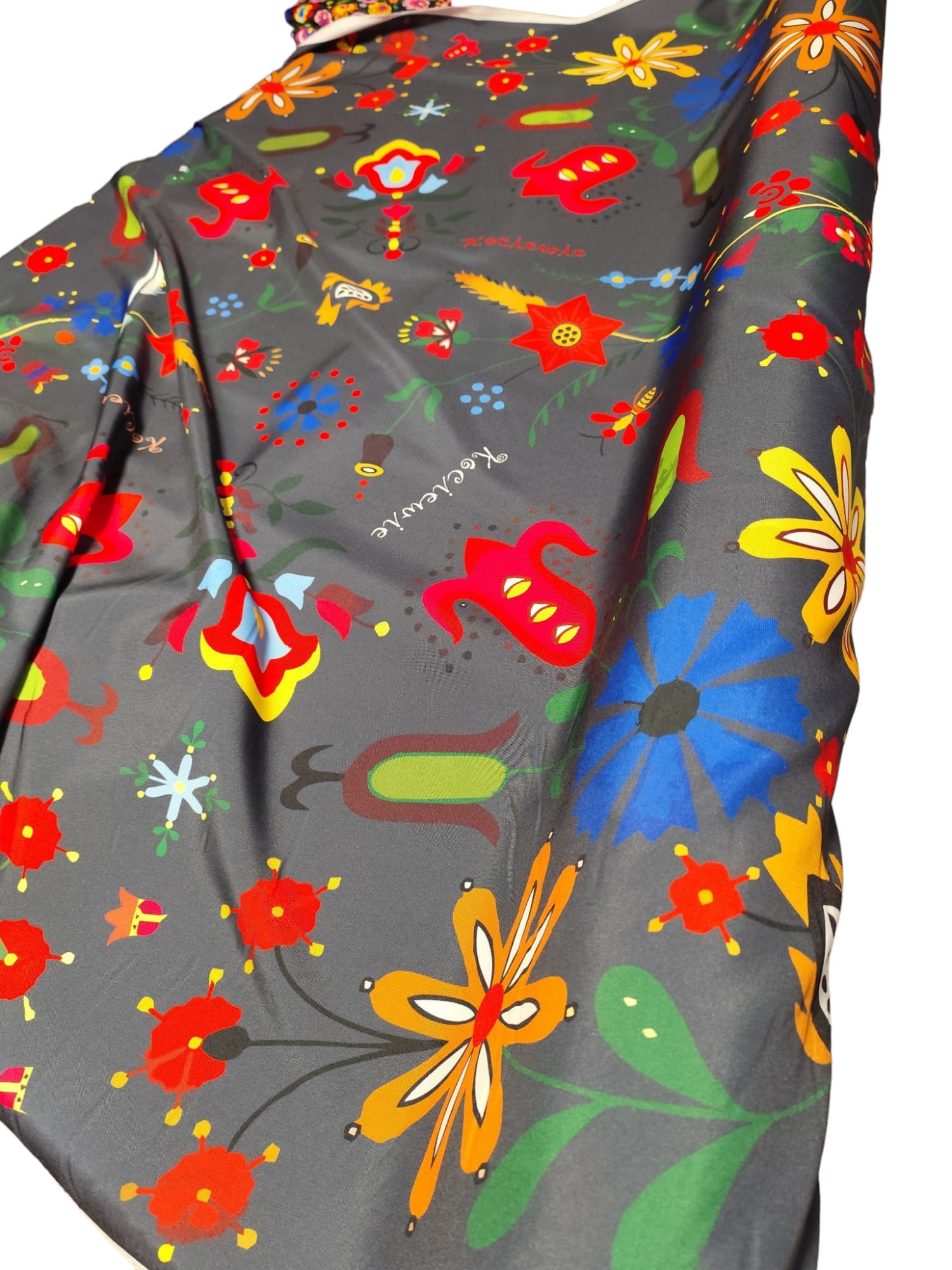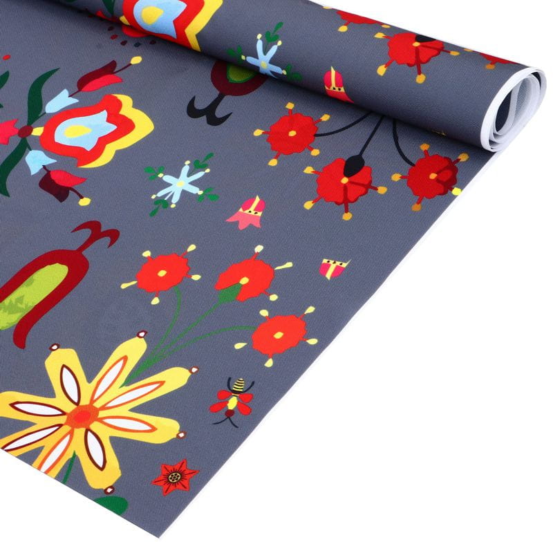 Idealnie nadaje się do szycia spódnic, fartuszków, ozdób oraz wystroju dziecinnego pokoju (worki, poduszki, choinki i zabawki). Projekt wzoru na materiale inspirowany tradycyjnymi motywami ludowymi haftu z Kociewia.