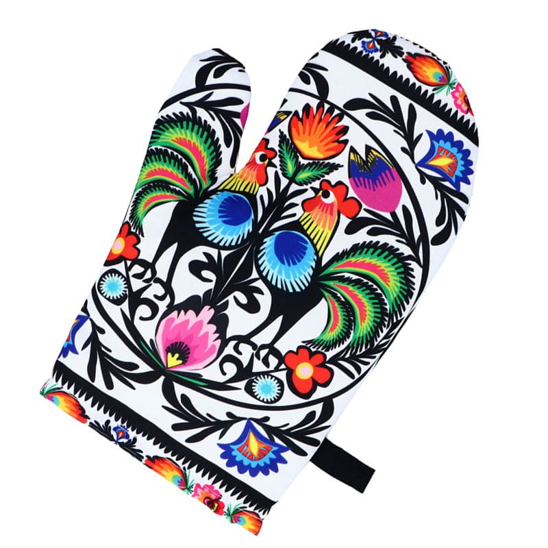 Rękawica kuchenna Kurpie. Niezbędna w każdej kuchni. Intensywny, folkowy wzór uprzyjemni prace kuchenne. Projekt inspirowany tradycyjnymi wycinankami kurpiowskimi. Wykonana z wysokogatunkowej tkaniny poliestrowej o gramaturze 160 g.