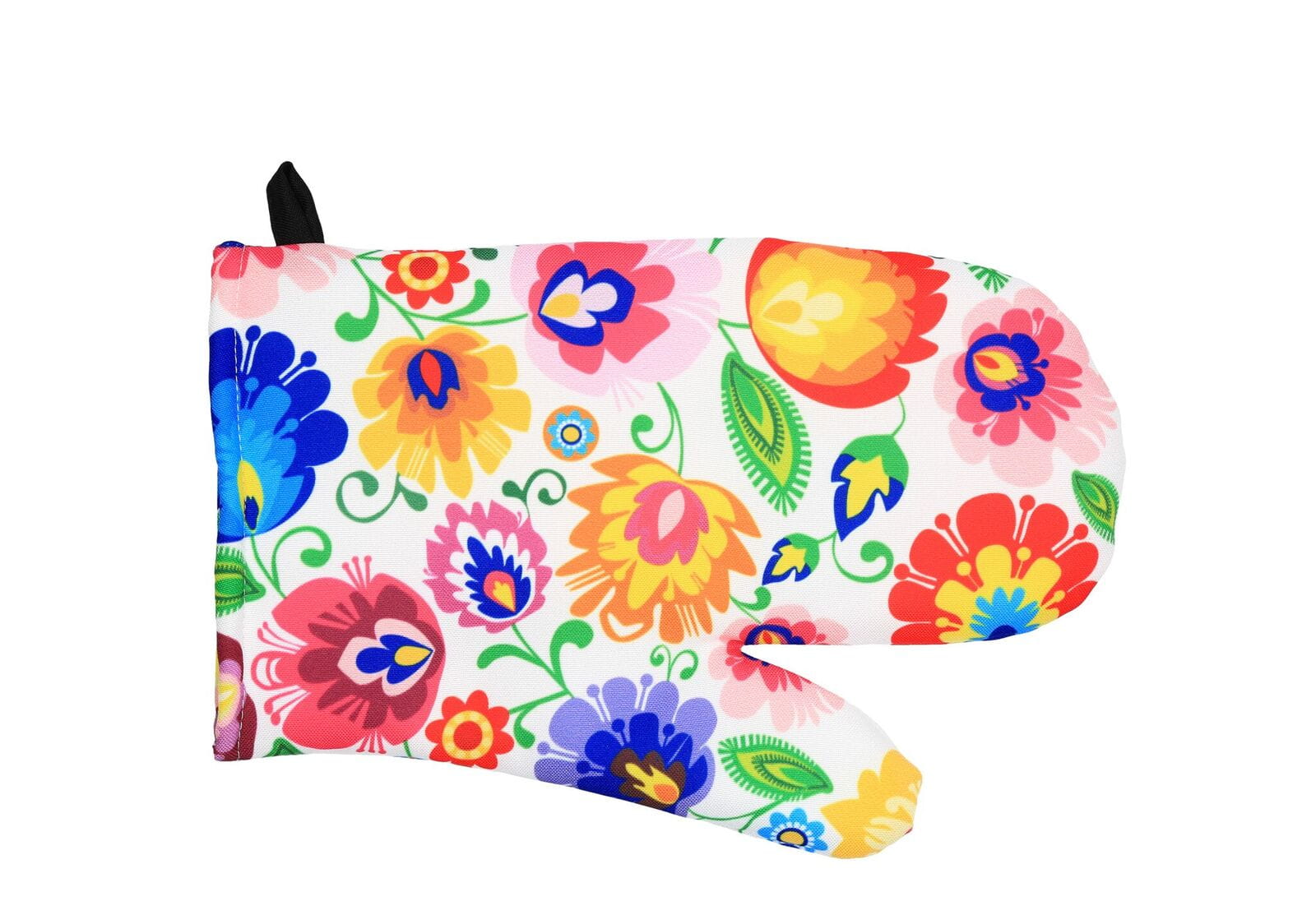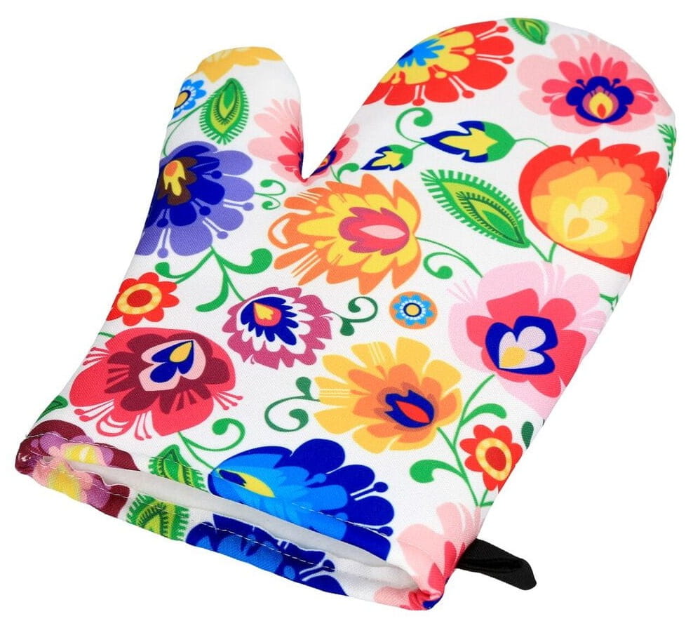 Niezbędna w każdej kuchni. Intensywny, folkowy wzór uprzyjemni prace kuchenne. Projekt inspirowany tradycyjnymi ludowymi haftami łowickimi. Rękawica wykonany z wysokogatunkowej tkaniny poliestrowej o gramaturze 160 g. Wyprodukowano na Polsce.