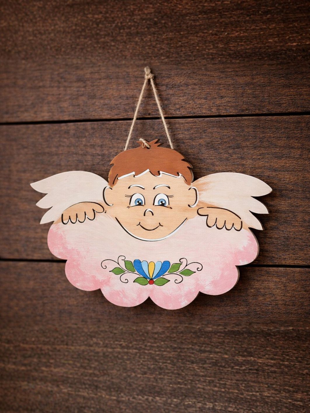 Duży aniołek kaszubski na chmurce (malowany na drewnie - błękitny), zdobiony elementem kaszubskiej palmety.