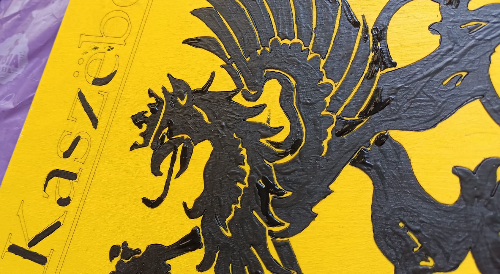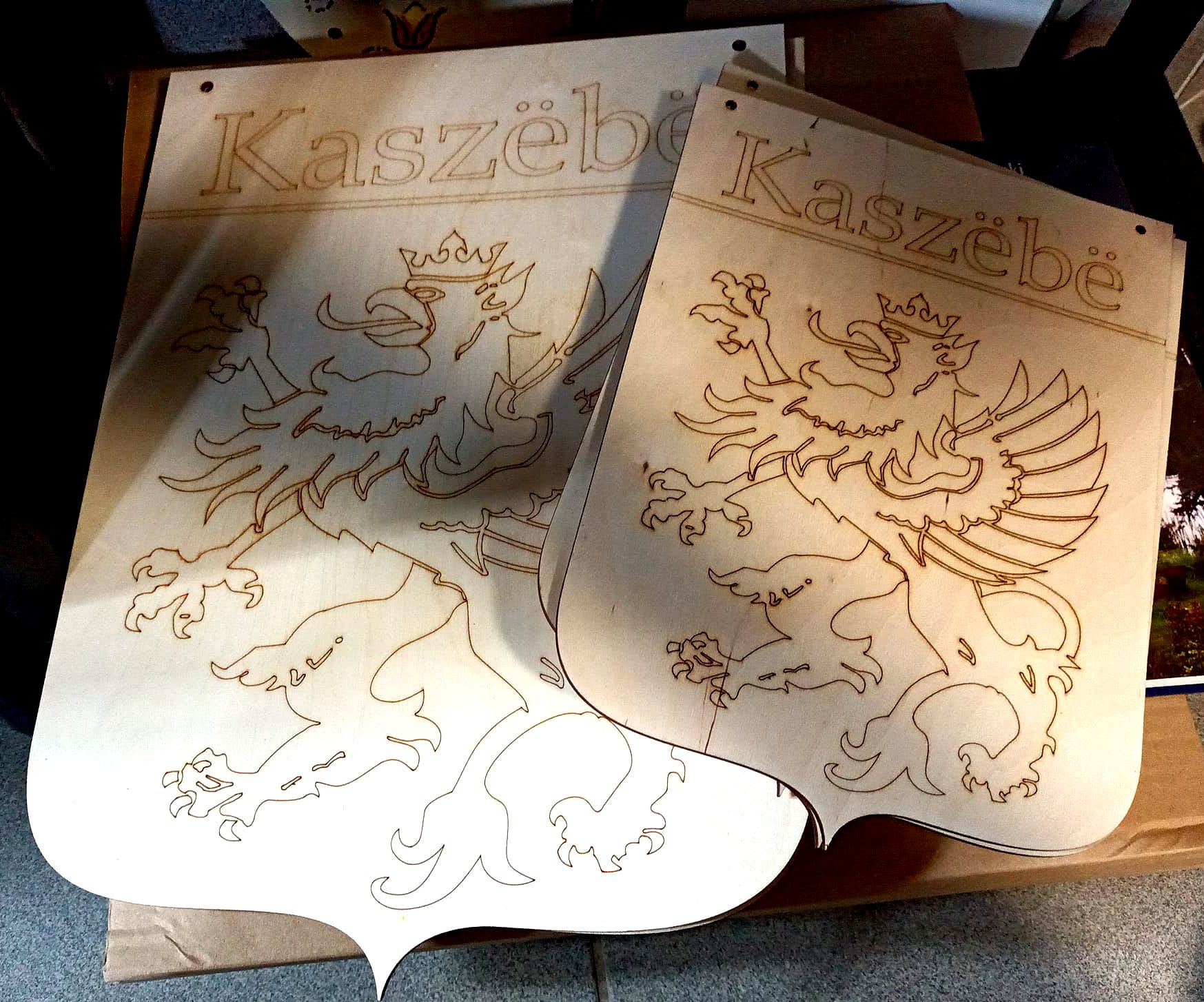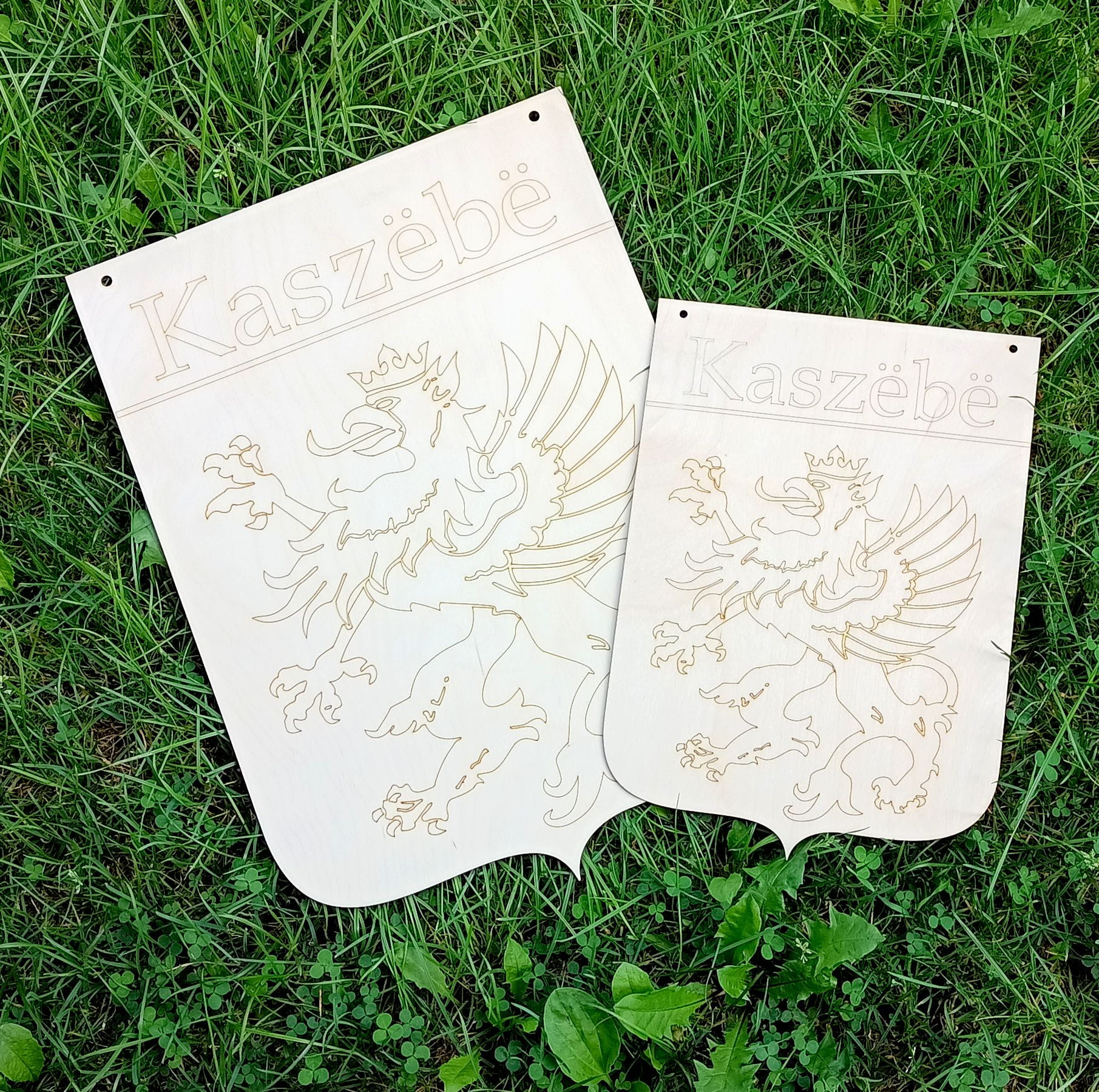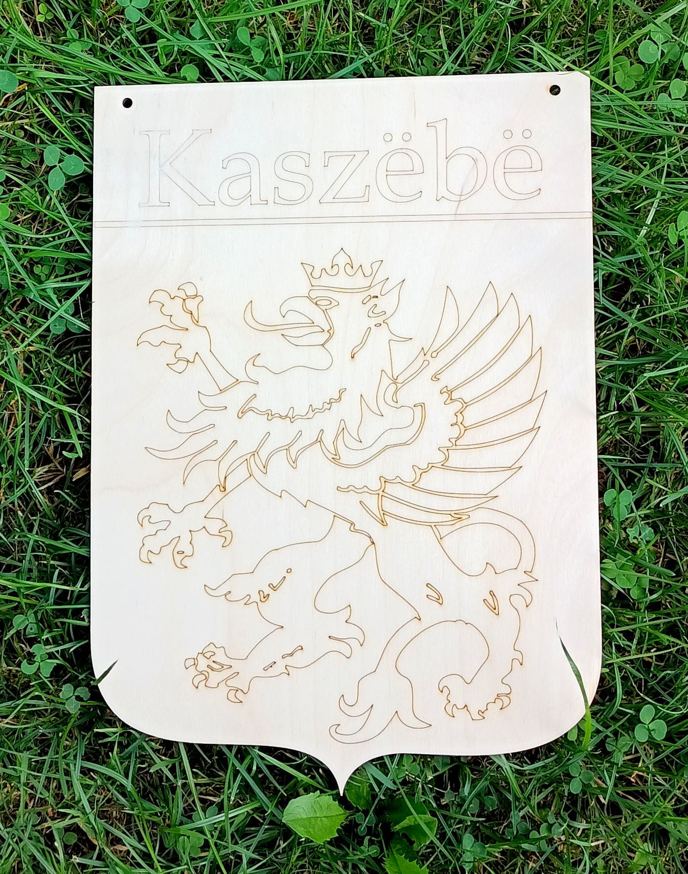 Drewniany herb z laserunkiem gryfa kaszubskiego, gotowy do pomalowania. Herb na drewnie może pozostać naturalny, laser jest widoczny i bardzo estetyczny.