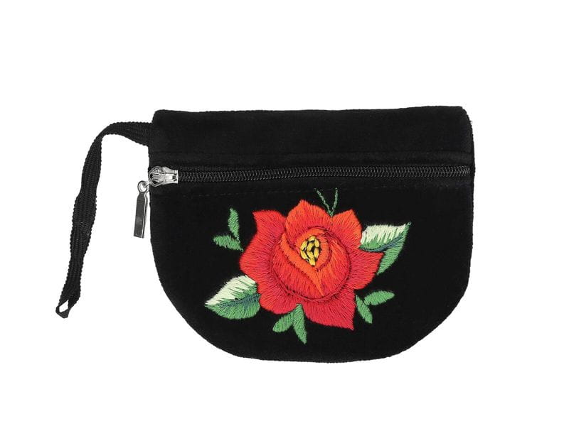 Ręcznie szyta i haftowana portmonetka wykonana z aksamitu. Portmonetka jest ręcznie haftowana przez łowicką twórczynię ludową w tradycyjny ludowy haft łowicki.