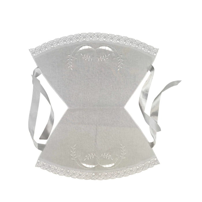 To wyjątkowe rękodzieło wykonane jest z tkaniny bawełnianej, z zastosowaniem haftu ręczno-maszynowego. Stylowy, ażurowy wzór nadaje całości lekkości, a koronka wprowadza klasyczną elegancję.